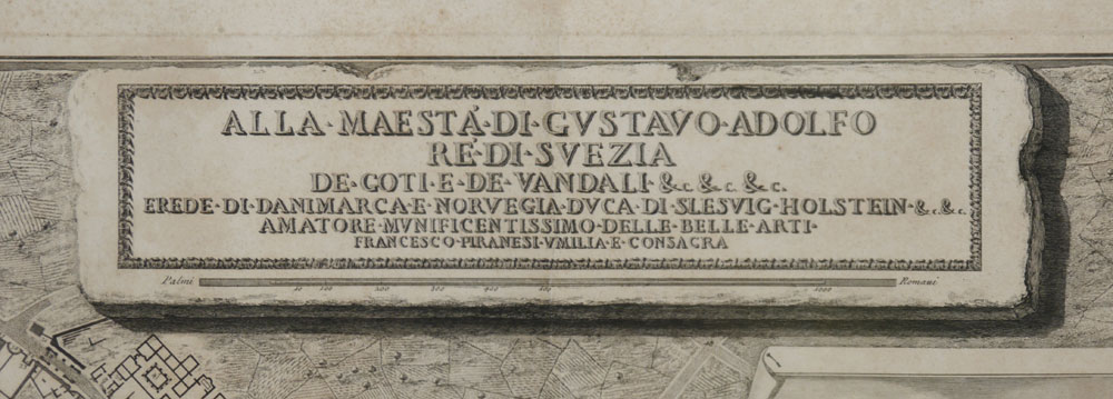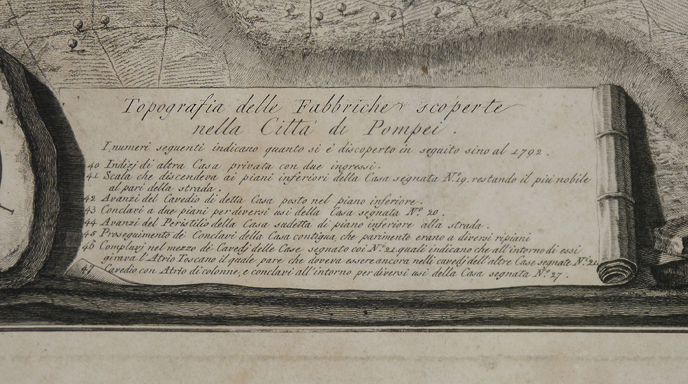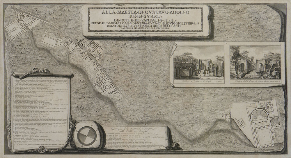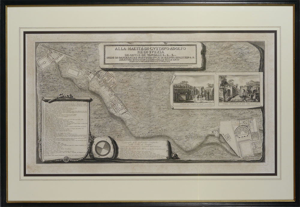 PIRANESI, Fransesco, (Italian, 1758-1810): 1785 Topography map of the Excavations of Pompeii, Italy. With title, site key, compass, vignette with architectural drawings. Sight size 19 1/2'' x 34 1/4'', framed and double matted 29 1/4'' x 49 1/2''.