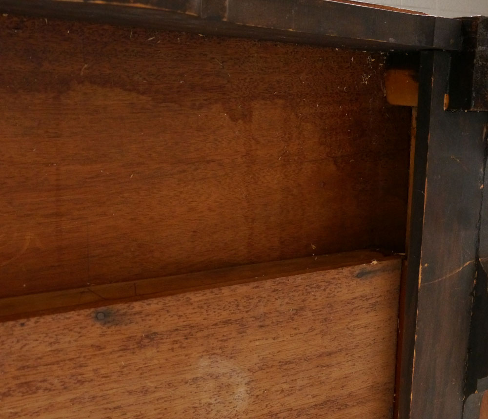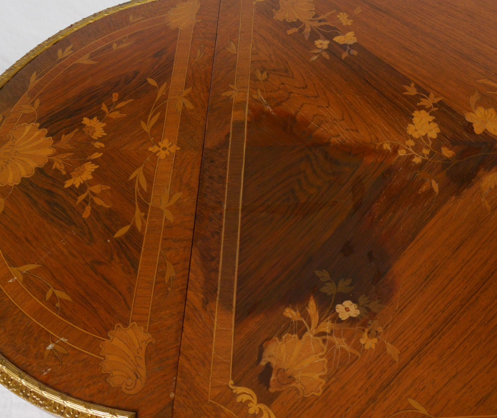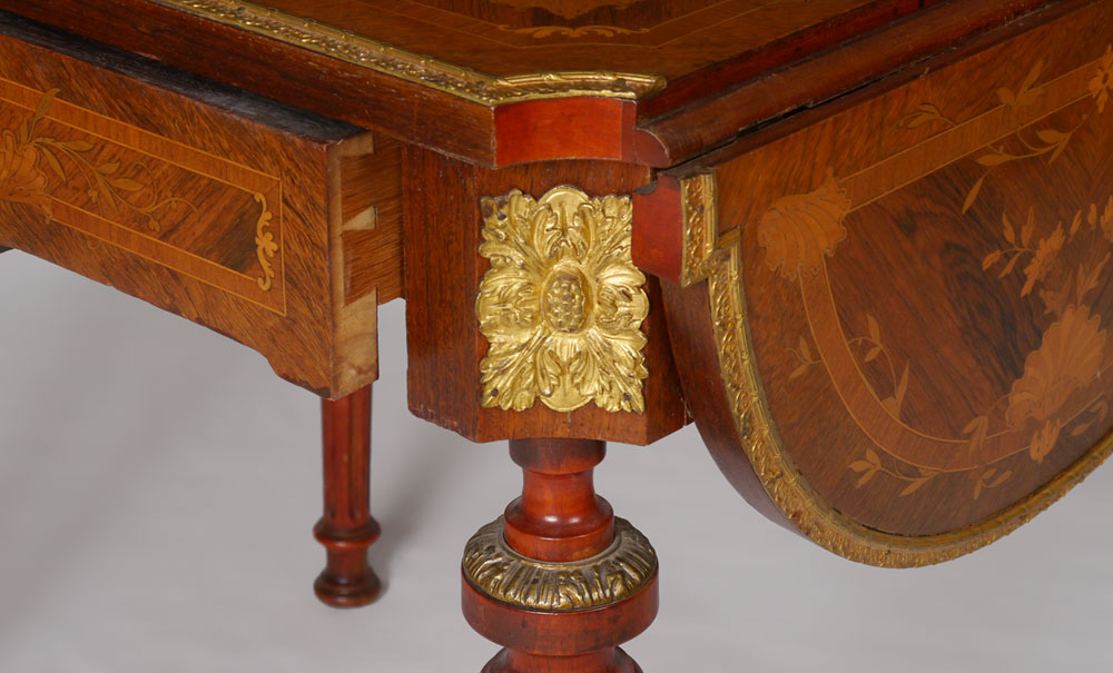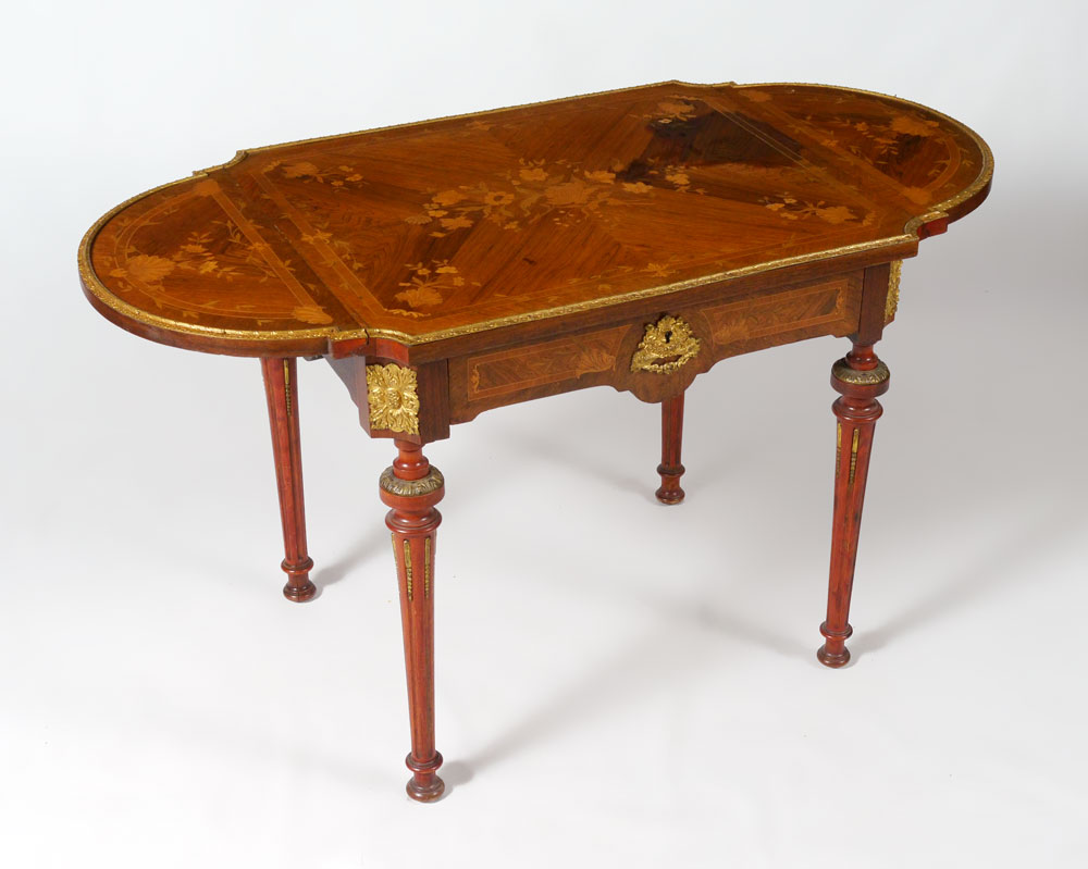LOUIS XVI STYLE MARQUETRY DROP LEAF TABLE: Floral marquetry inlaid top and side drop leaves with gilt metal trim. Skirt with single drawer, applied ormolu mounts on drawer and corners. Reeded tapered legs. Overall measures 24 1/2'' h. x 28 1/4'' x 22 1/2'' with 9'' drop leaves.