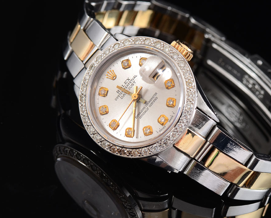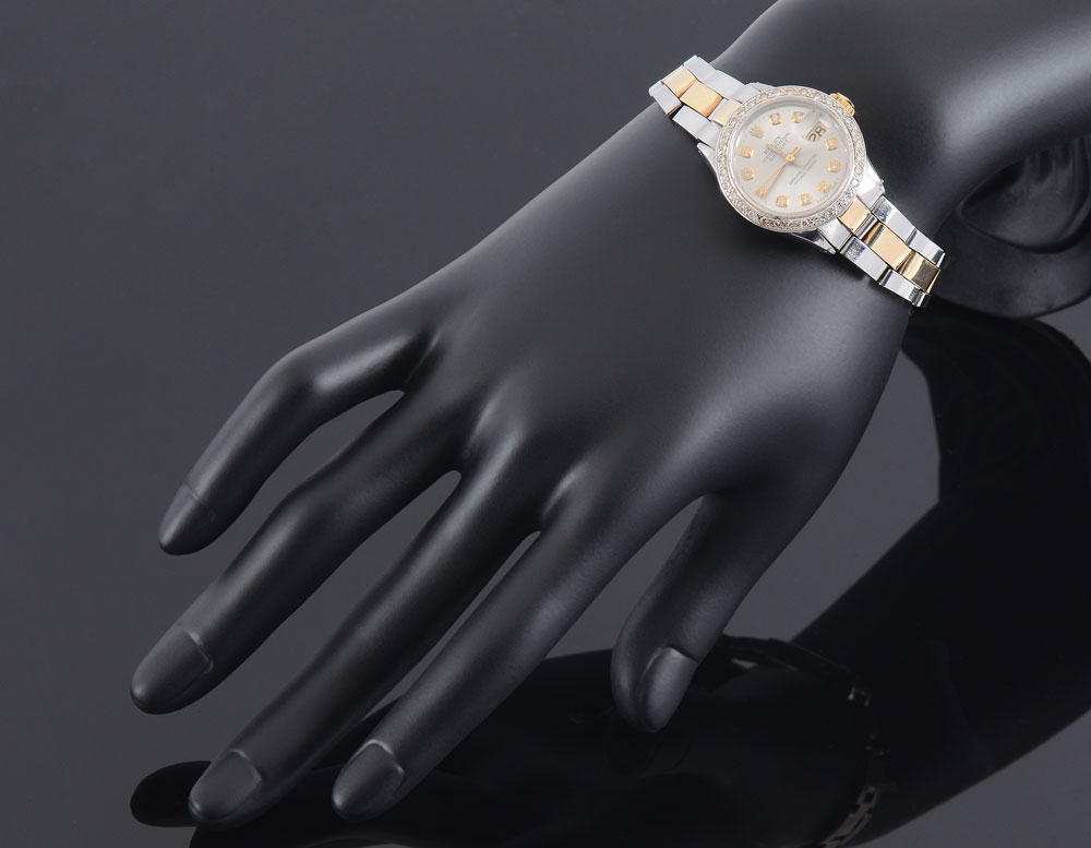 LADIES DIAMOND ROLEX WRIST WATCH: 14k Gold and Stainless Oyster Perpetual DateJust, Superlative Chronometer. Diamond bezel and hour bars. Approx. 6.5'' bracelet. Currently running and keeping time.