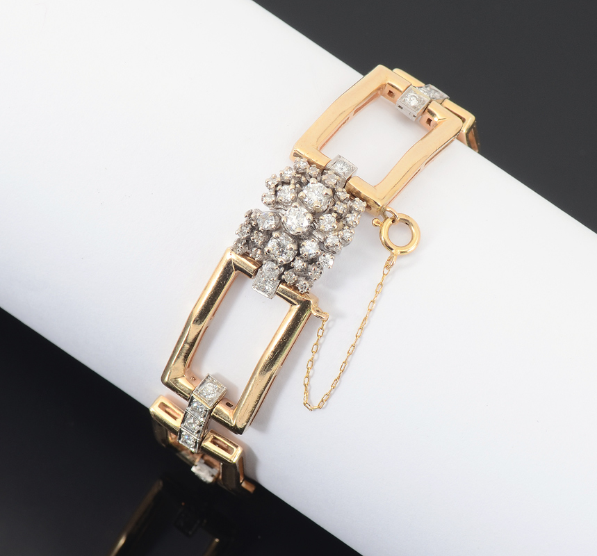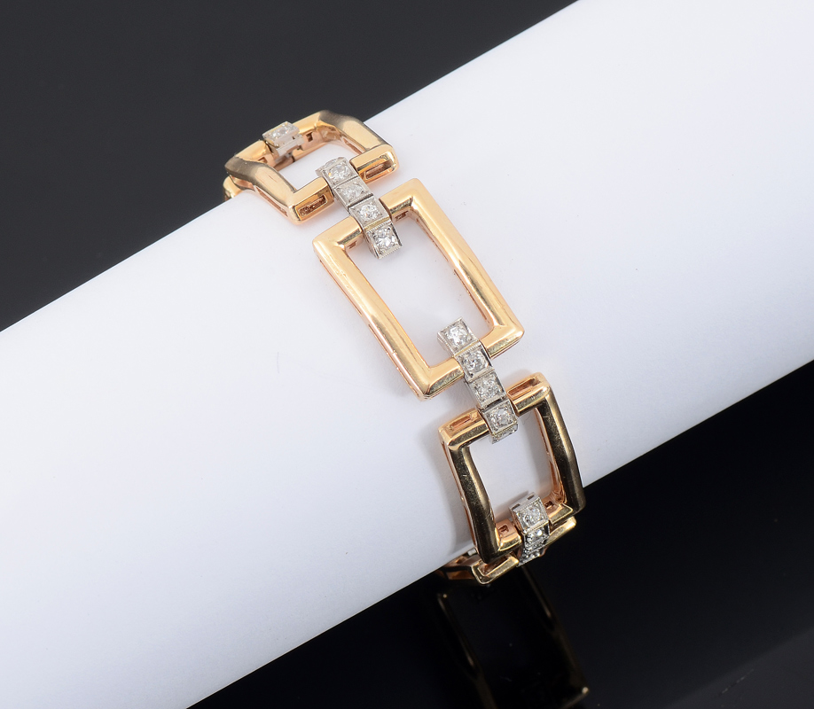 14K GOLD & PLATINUM DIAMOND BRACELET: Large rectangular yellow gold links joined by diamond bands set in platinum. The clasp is also a generous showing of diamonds. The bracelet has 51 round single cut and full cut diamonds totaling approx. 1.80 Ct., rated VS in clarity and G-H color. Bead and prong set. Length 6 3/4''. Weight 30.5 grams.