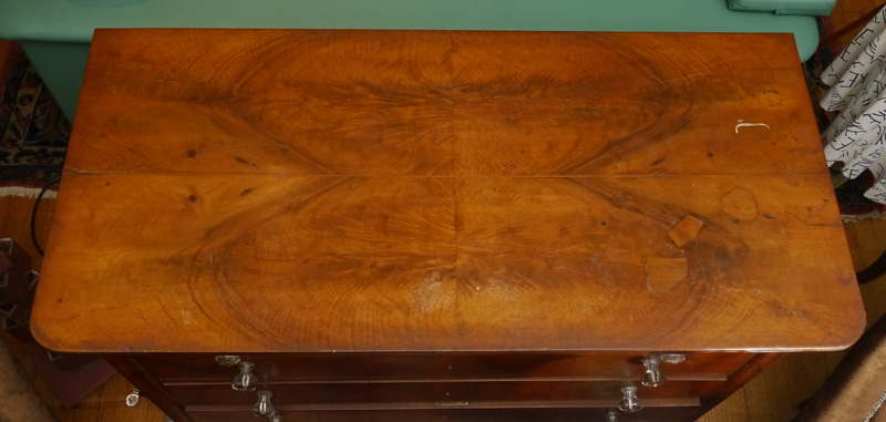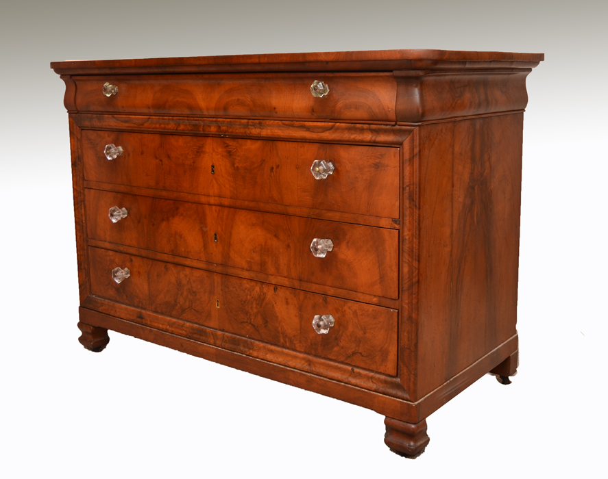 EARLY 4 DRAWER MAHOGANY DRESSER: Shaped top drawer over 3 drawers with glass pulls, shaped feet on castors. Overall measures 35 1/4'' h. x 50'' x 23 1/2''.