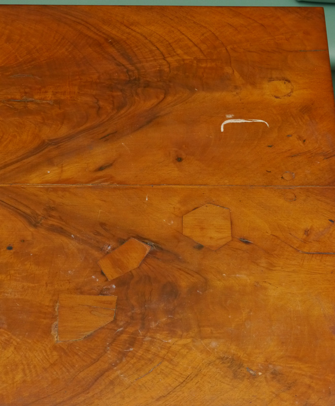 CONDITION: Age splits to sides, top with several repairs, in need of cosmetic restoration.