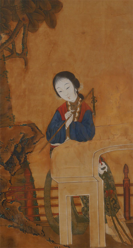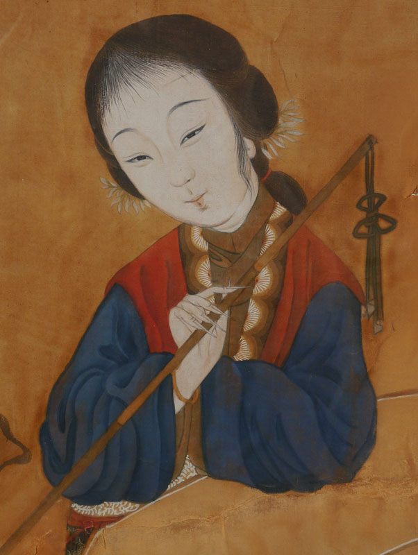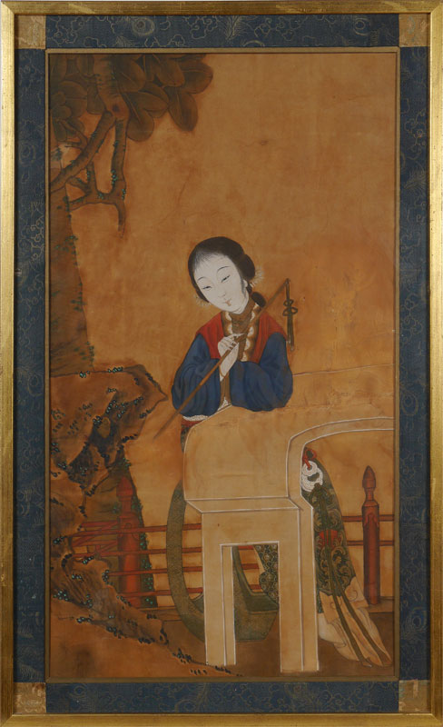 LARGE ORIENTAL PAINTING OF YOUNG GIRL: Watercolor and Gouache, sight size 35'' x 20'', framed, 41'' x 25 1/2''