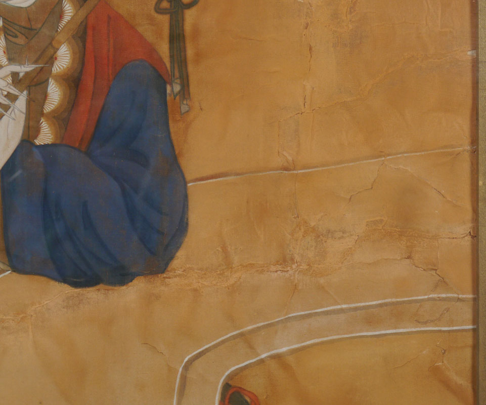 CONDITION: Visible repairs, glued down, sold as is.