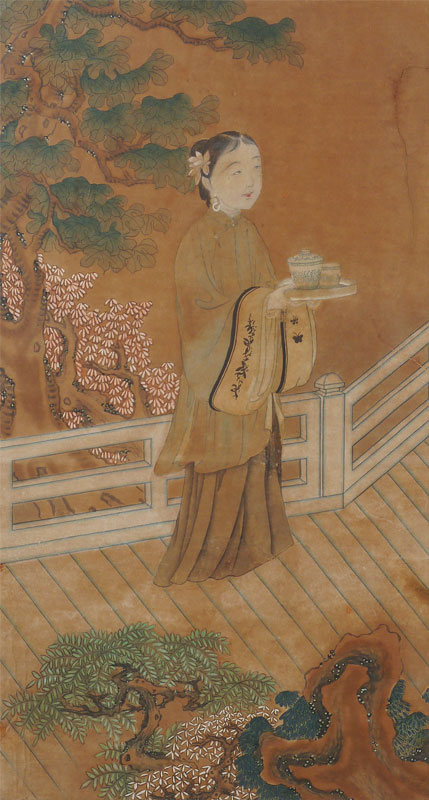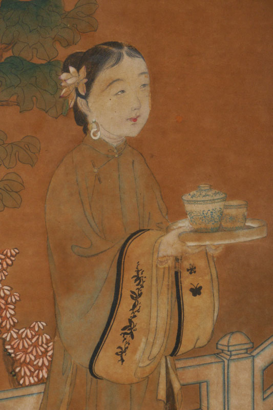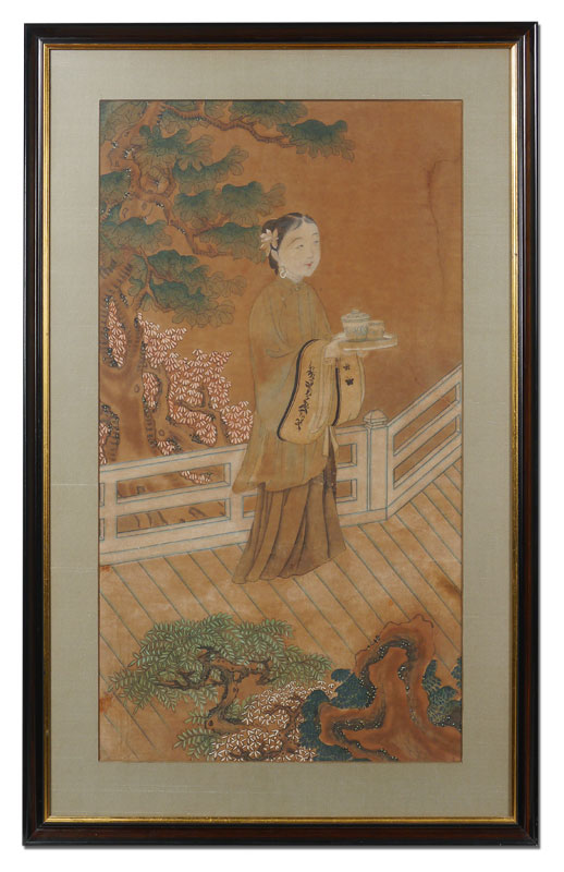 EARLY ORIENTAL PAINTING TEATIME: Watercolor and Gouache, sight size 28'' x 15 1/2'', framed, 35 1/2'' x 22 1/2''.