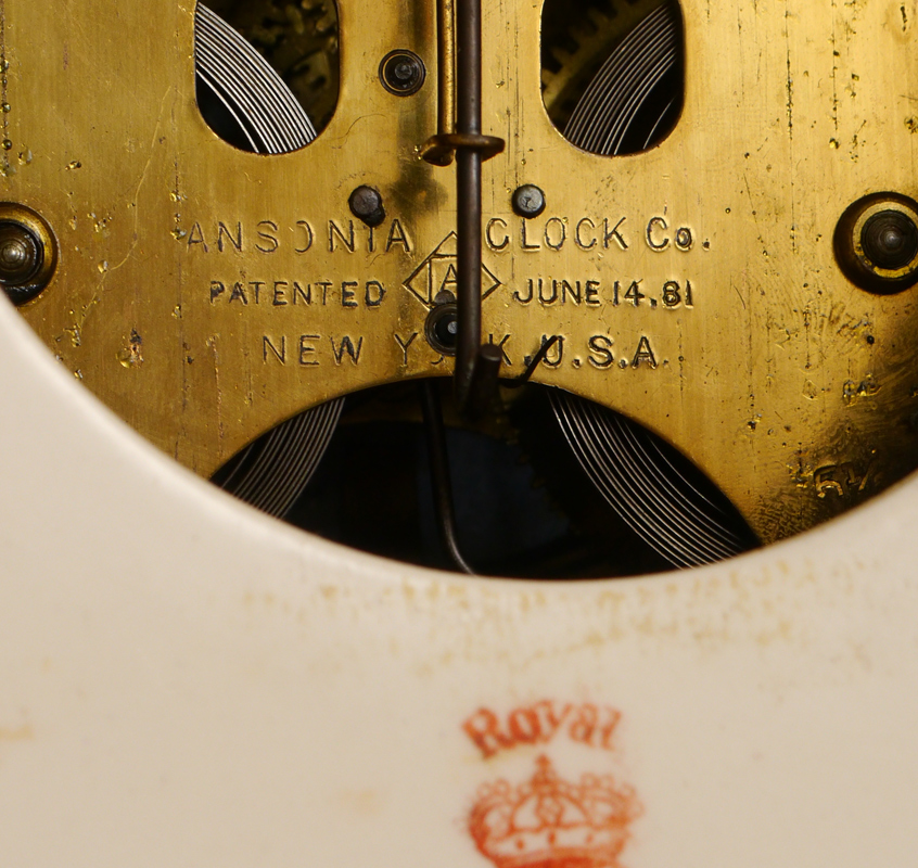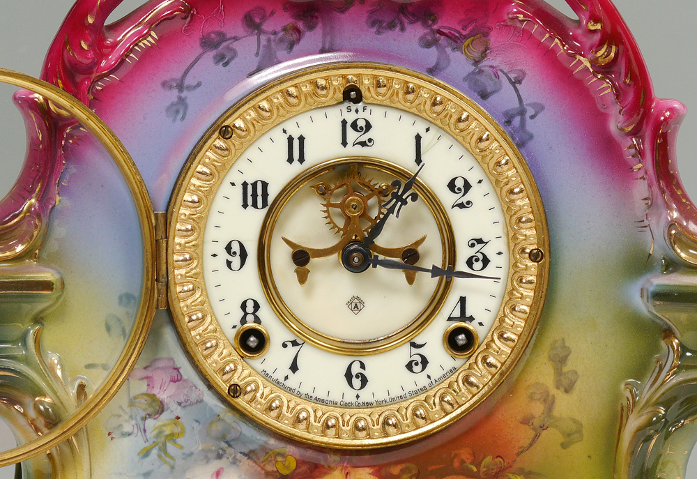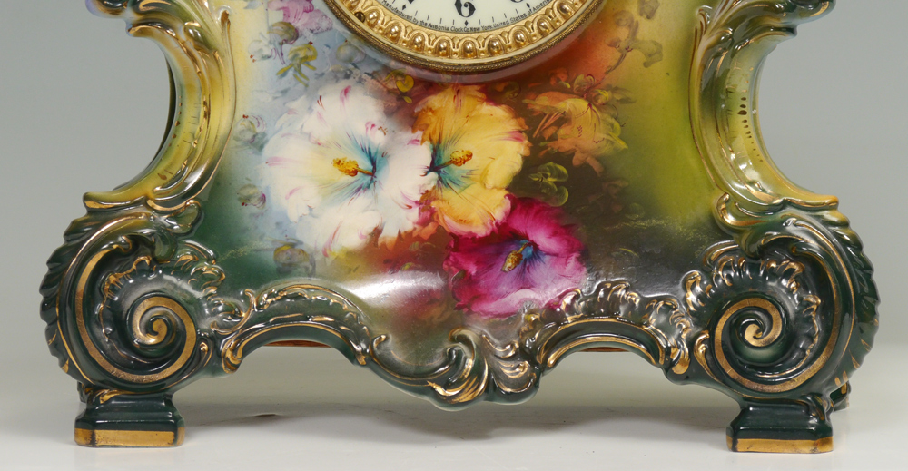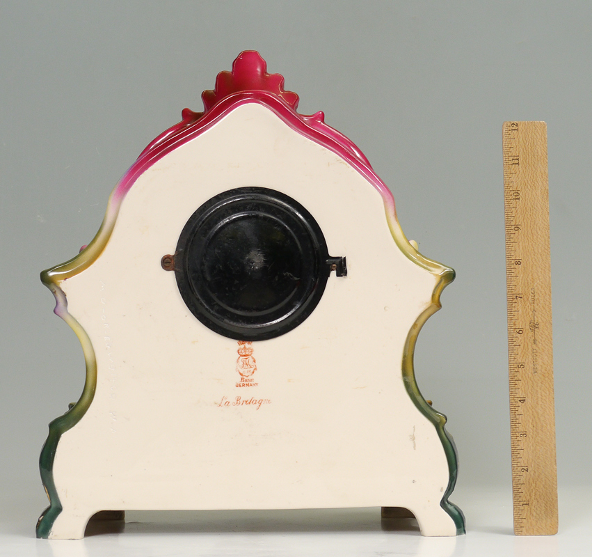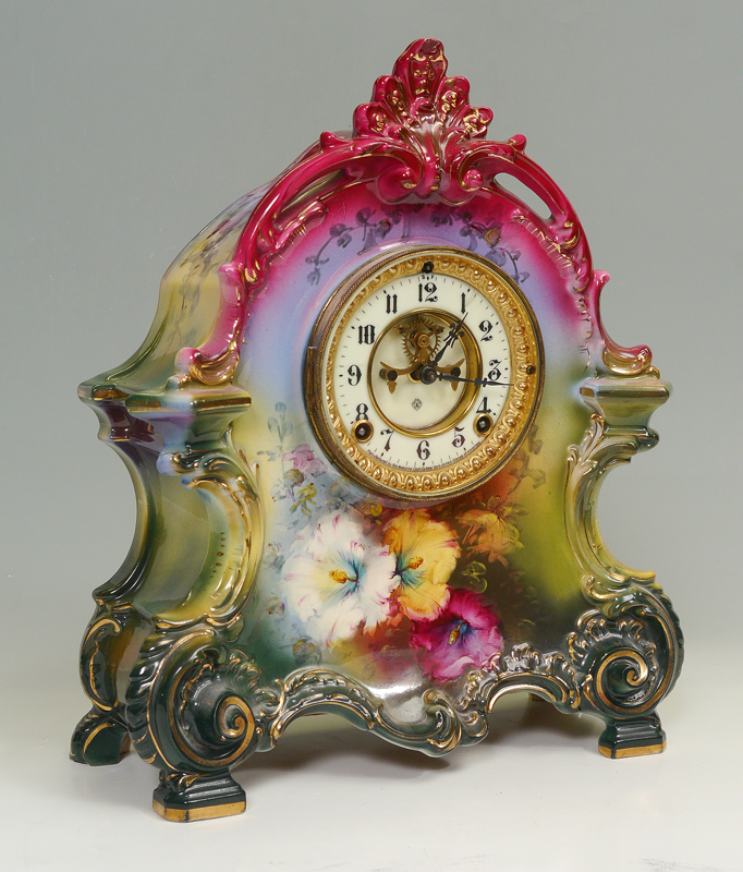 ANSONIA ROYAL BONN PORCELAIN CLOCK ''LA BRETAGNE'': Multi-hued rainbow effect case with hand painted floral and gilt decoration. Case marked on back with red Royal Bonn mark, ''La Bretagne''. Ansonia porcelain dial with open escapement, Arabic numerals, time and strike movement. Overall measures 14 1/2'' h. x 12 1/2'' x 5''.