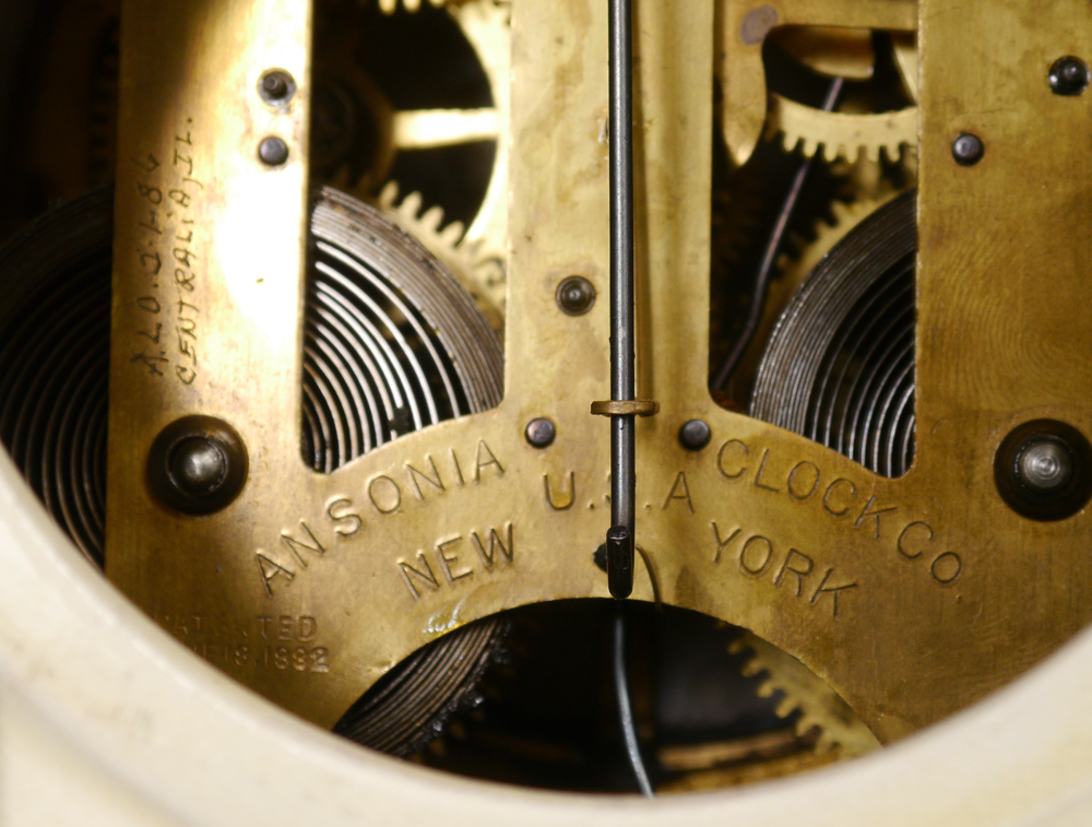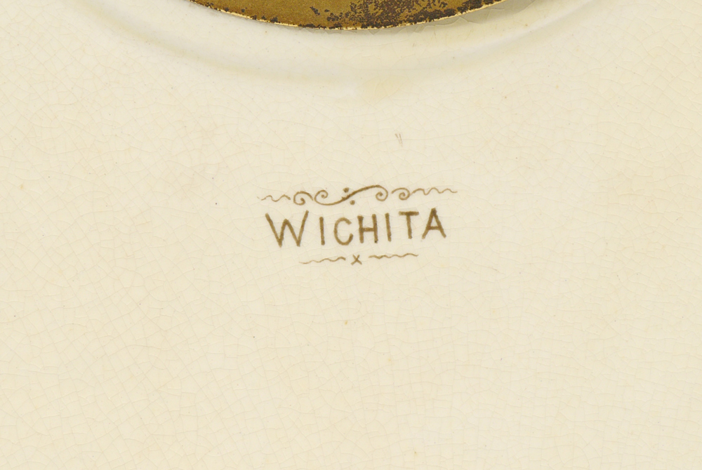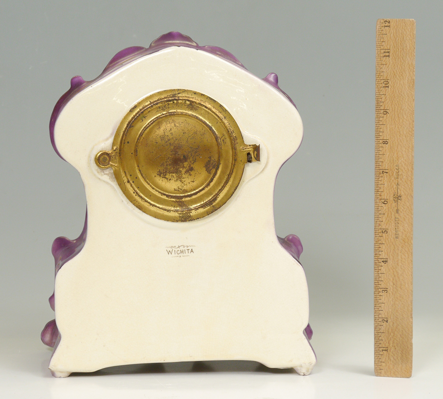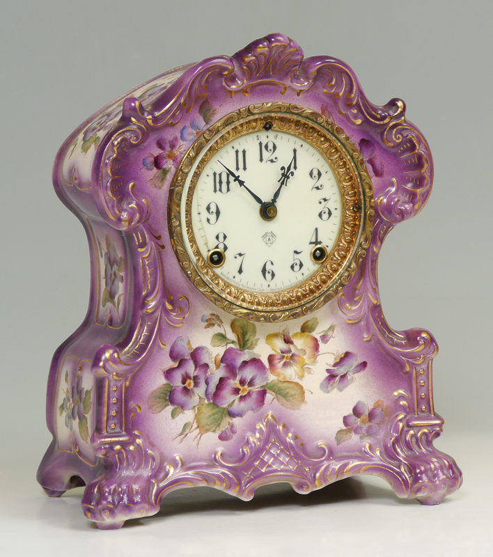 ANSONIA ROYAL BONN PORCELAIN CLOCK ''WICHITA'': Purple hued case with hand painted floral and gilt decoration. Porcelain dial with Arabic numerals. Time and strike movement. Overall measures 11 3/4'' h. x 10'' x 5 3/4''.