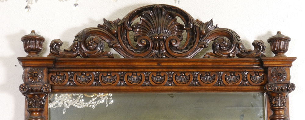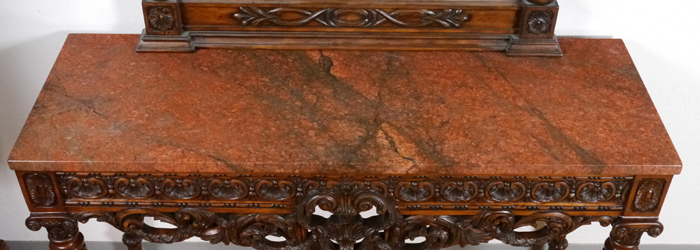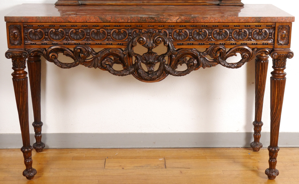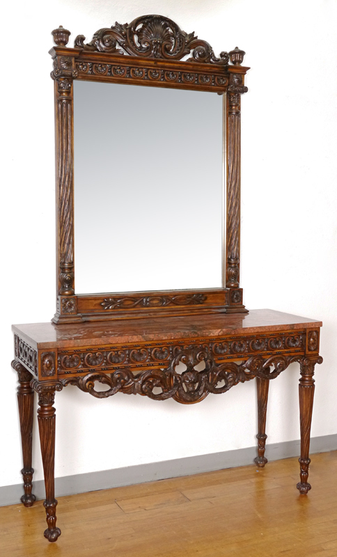 MARBLE TOP CARVED HALL TABLE AND MIRROR: Mirror with carved foliate scroll and shell motifs, urn finials, applied half column decoration. Crimson red variegated marble top over matching carved apron, turned legs. Overall with mirror attached approx. 100'' h. x 60'' x 22''.