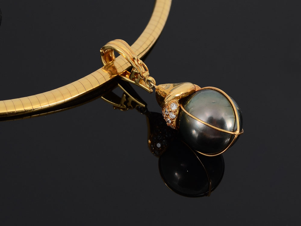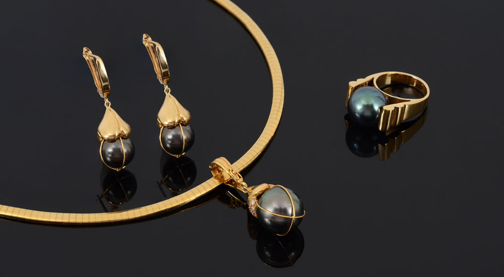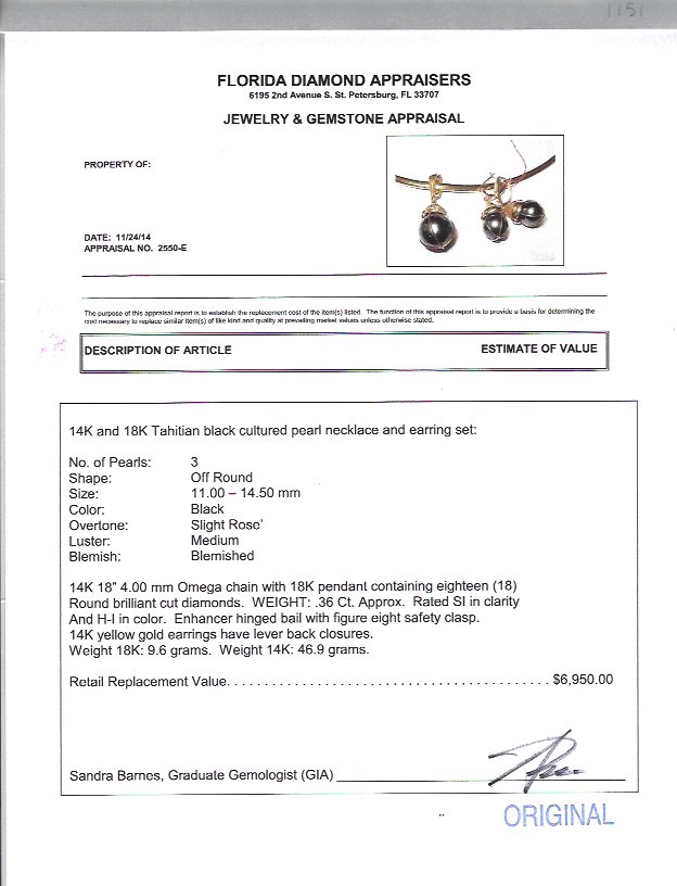 BLACK TAHITIAN PEARL NECKLACE AND EARRINGS: 3 Tahitian black pearls, 11-14.6 mm with a slight rose' overtone. The 18K yellow gold pendant enhancer with diamonds totaling .36 Ct., the 4mm Omega chain is 14K. Earrings are 14k yellow gold with pierced lever back closure, length 1.5''. Sold together with a certified 14 mm Majorca pearl ring, 14K gold vermeil, size 7. Ring weight 13.9 grams. Sold with current Florida Diamond Appraisers GIA graduates appraisal for $6,950.