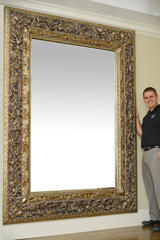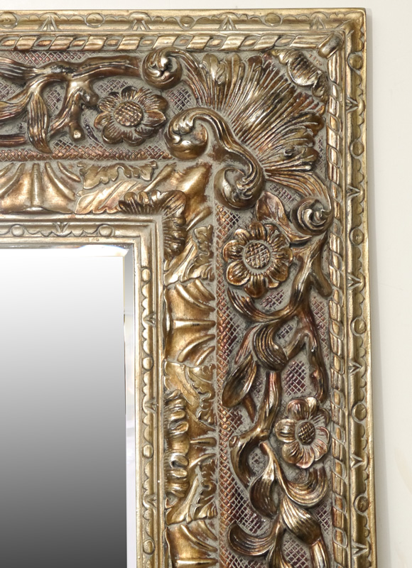 PALATIAL CONTEMPORARY GILT PARLOR MIRROR: Molded composite gilt frame with floral motif. Overall measures 96 1/2'' h. x 73'' x 3''.