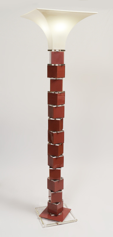 NEAL SMALL ATTRIBUTED ACRYLIC FLOOR LAMP: Clear base with pink accent, alternating cube body with pink and clear cubes, flared white shade. No visible tag or label. Overall 66 1/2'' h. x 18'' x 18'' with shade attached.
