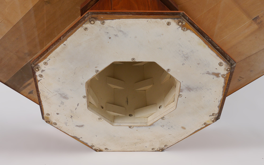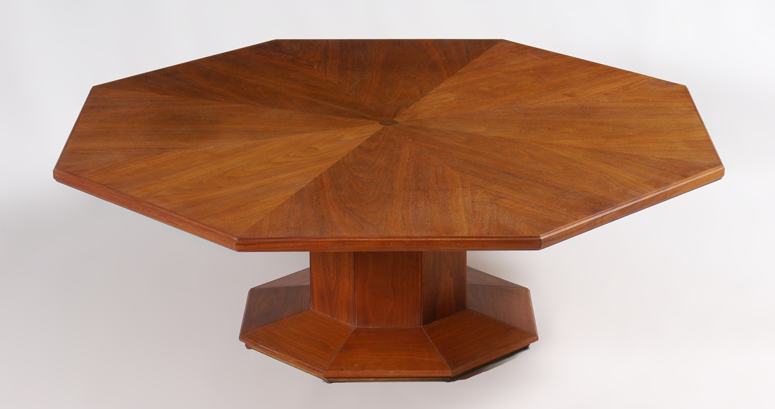 FOSTER MCDAVID MID CENTURY MODERN OCTAGONAL COFFEE TABLE: Manufactured by Tampa designer Foster McDavid, octagonal top with flared pedestal base. Measures 17 1/4'' h. x 48'' dia., From the personal collection of the McDavid family.