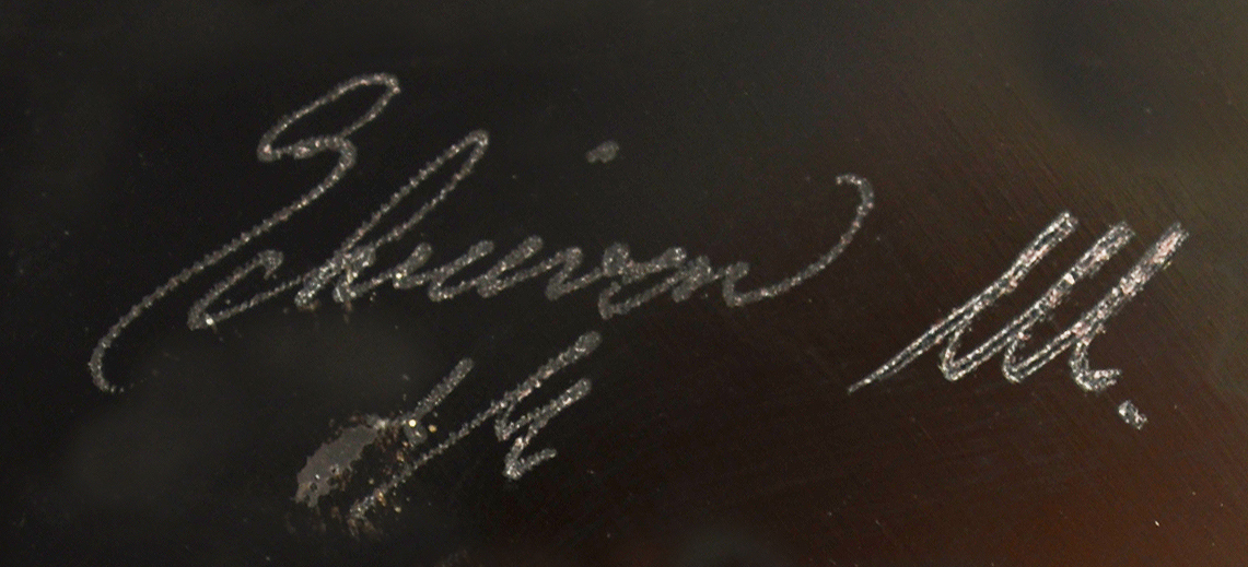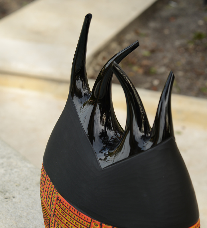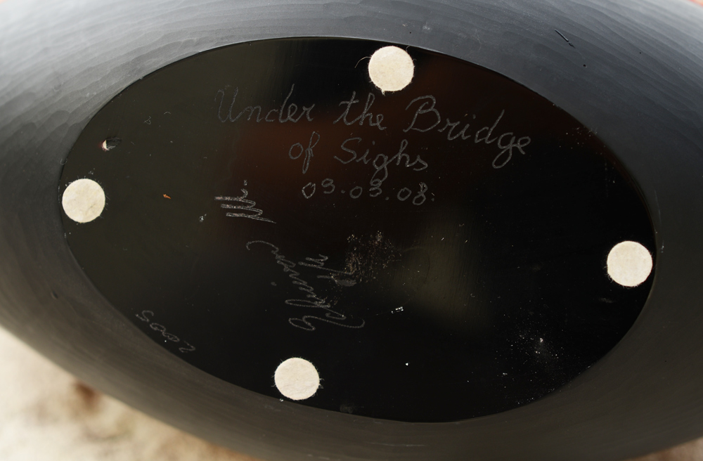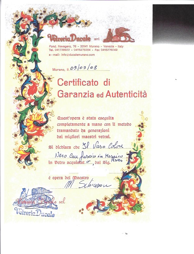 MURANO MASSIMILIANO SCHIAVON ART GLASS SCULPTURE: Free form black glass vase with ribbed band of orange, reds. black and yellow mosaic designs. Signed on base ''Schiavon, M.'' and titled ''Under the Bridge of Sighs, 03.03.08''. Secondary mark of 2005 on edge of base. Sold with Vetreria Ducale Glass Factory Certificate of Authenticity. Overall measures 15 3/4'' h. x 12'' x 5''.