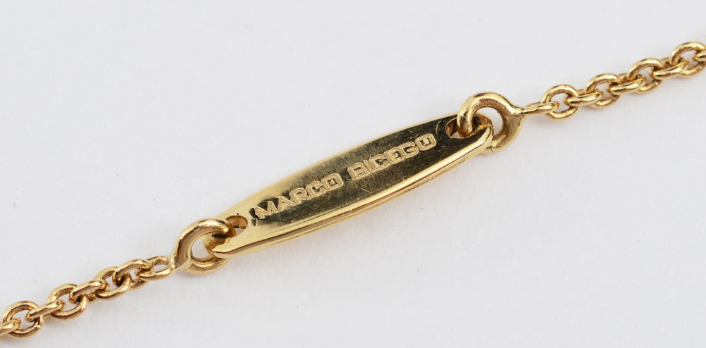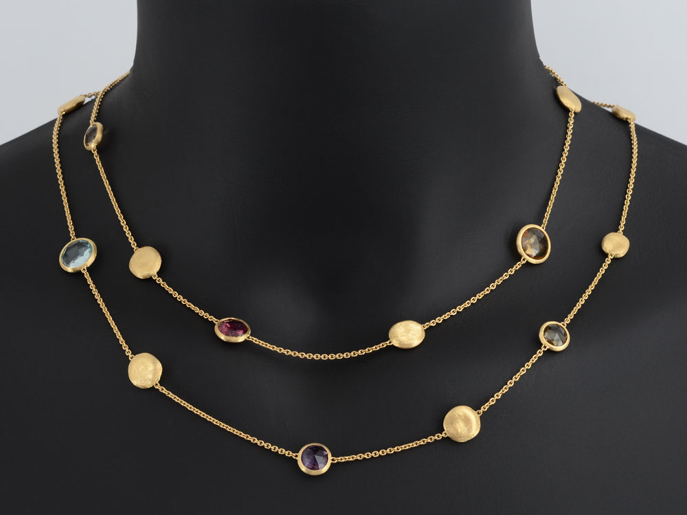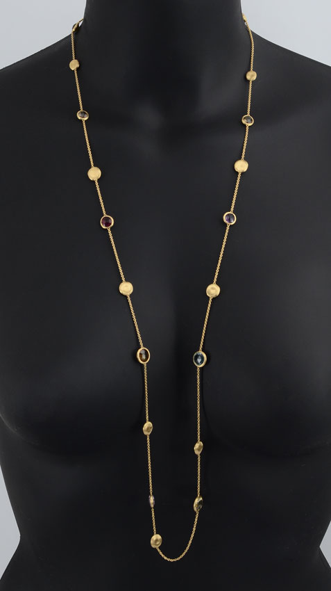MARCO BICEGO GEMSTONE CHAIN NECKLACE: From the Jaipur Collection. 36'' chain with stations of amethyst, topaz, green and pink tourmaline alternating with pillow discs of brushed gold. Weight 17.4 grams. Currently retails for $4500.