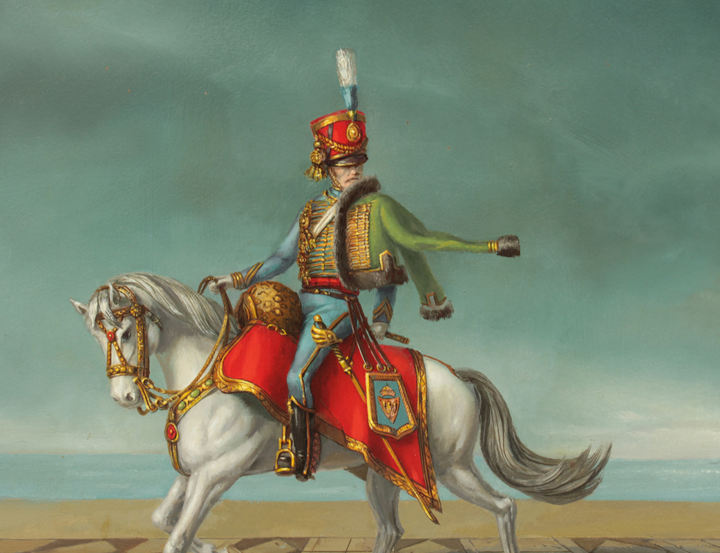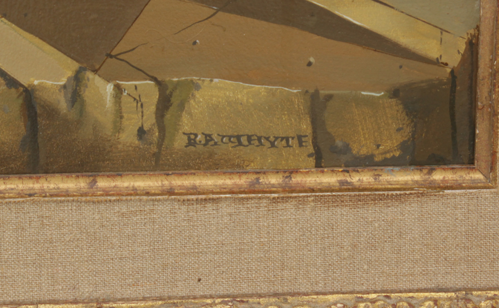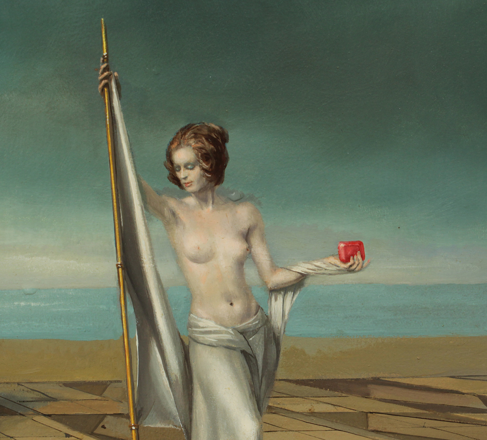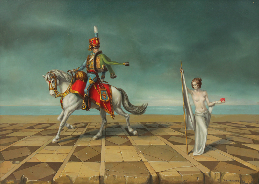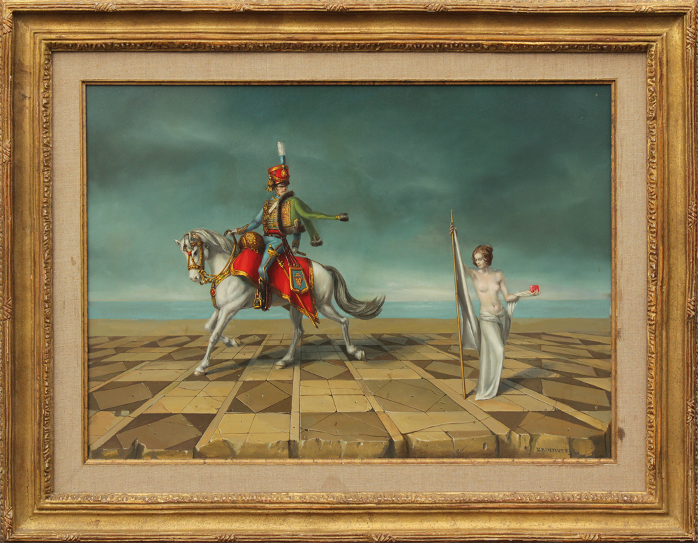 WHYTE, Raymond A., (Canadian-American, 1923-2002): ''Silver Sheath'', Depicts a mounted soldier on horseback with a scantily clad young beauty in a surreal infinity landscape, Oil/Masonite, 20'' x 28'', signed lower right, signed verso, custom carved and gilded frame, 28'' x 36 1/2'', original purchase price in 1975 was $2,450.