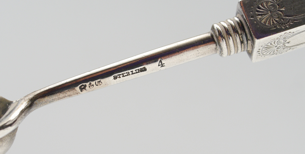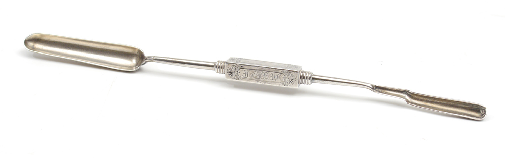 GORHAM STERLING DOUBLE SCOOP MARROW SPOON: Engraved and monogrammed center handle, Gorham cypher and marked Sterling. 10 1/4'' long, approx. 1.4 troy oz.