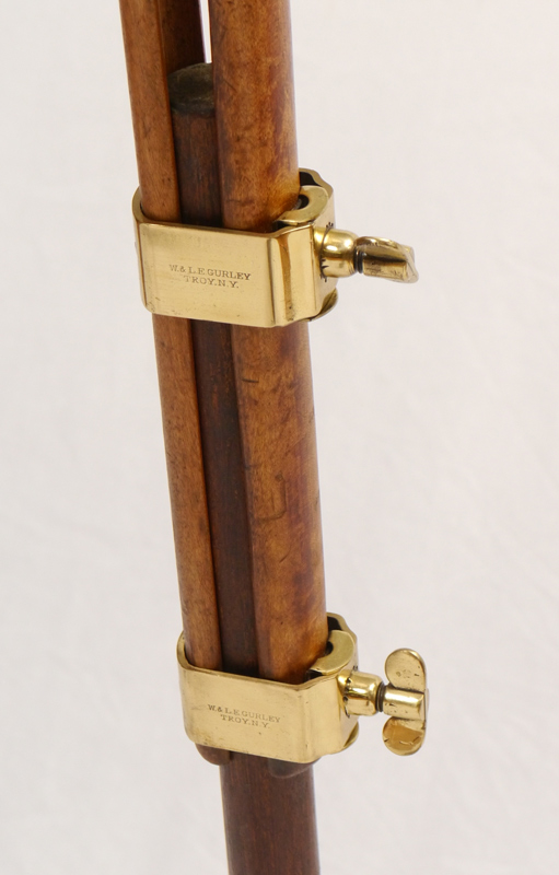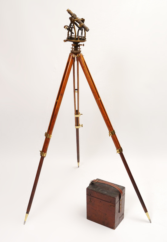 GURLEY BRASS SURVEYORS TRANSIT WITH ORIGINAL TRIPOD: Late 19th century production with no visible serial number, brass transit with level and silvered dial compass marked W. & L. E. Gurley, Troy, N. Y.. Transit overall measures 9 1/4'' h. x 8 3/4'' x 5 1/2''. Original carrying case with leather strap measures 11 3/4'' x 10'' x 7''. Sold with original wood and brass telescoping tripod, also marked Gurley on mounts.