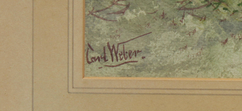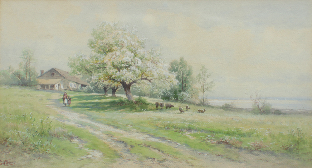 WEBER, Carl Philipp, (German-American, 1850-1921): Lakeside Landscape with Farmhouse, Sheep, & Two Figures Walking Along a Trail, Watercolor, Sight size 13 1/2'' x 25'', signed lower left, framed 21 1/2'' x 32 1/2''.