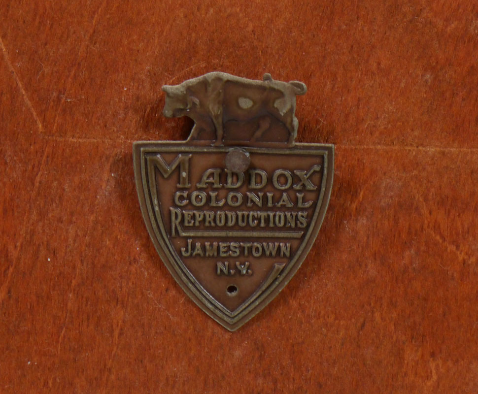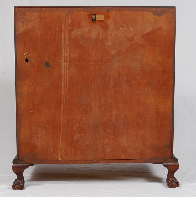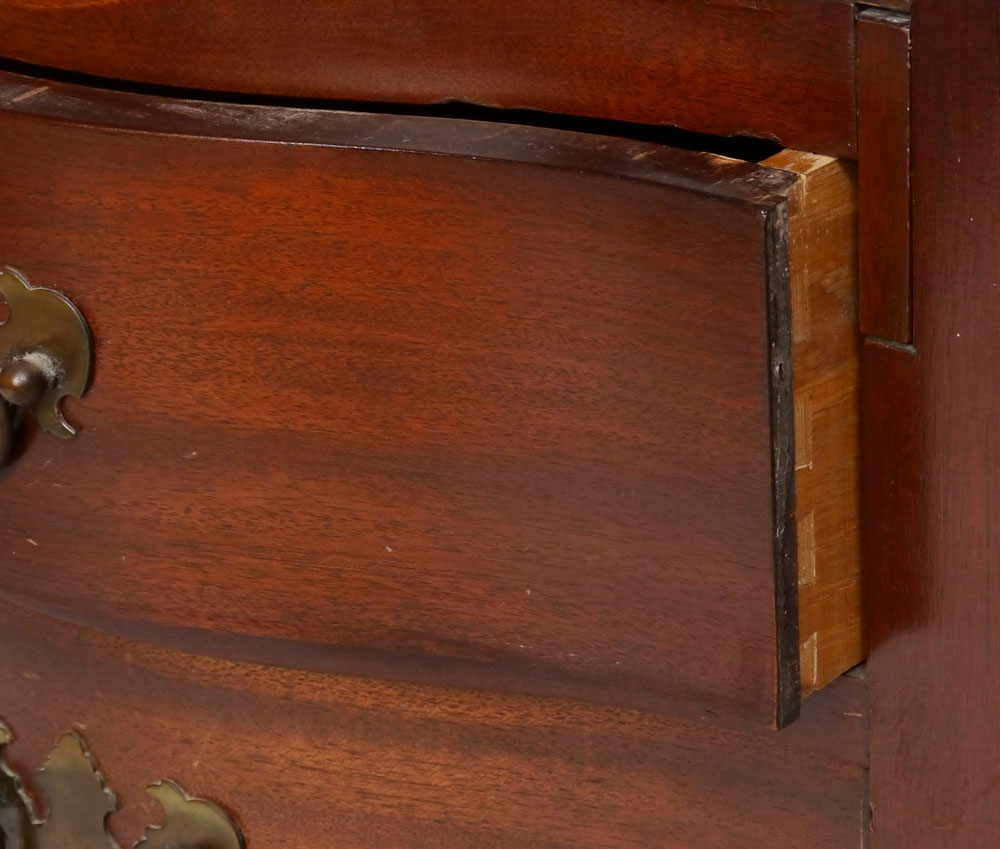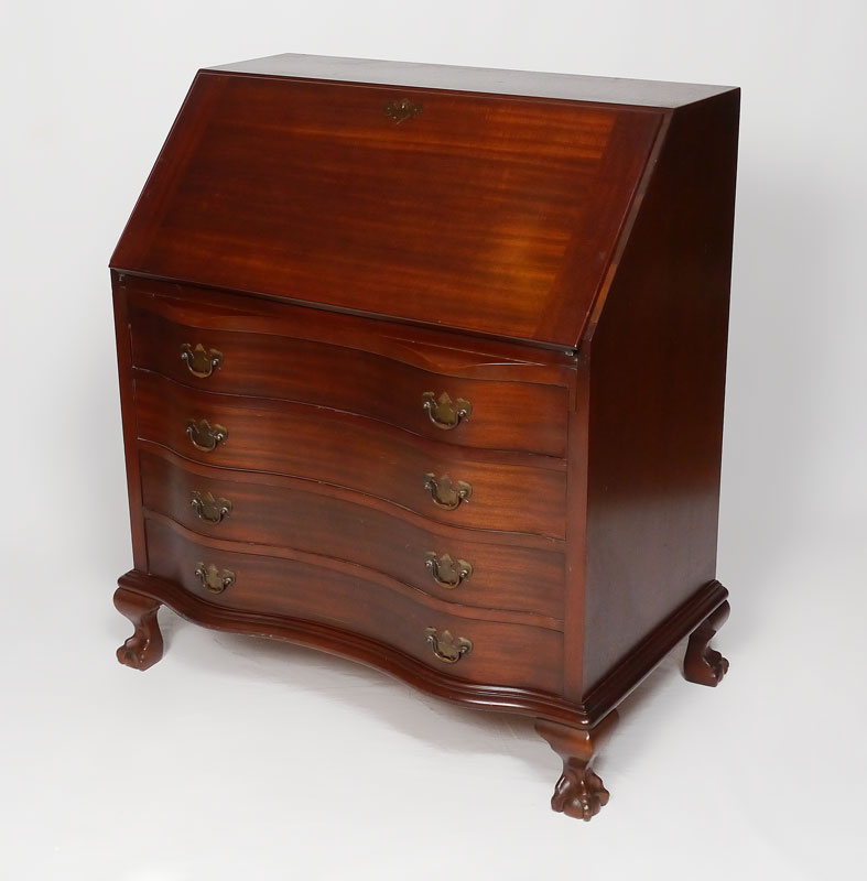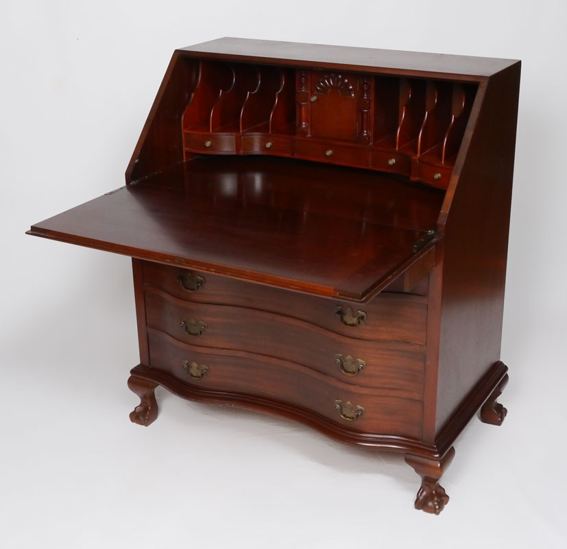 MAHOGANY GOVERNOR WINTHROP DESK: Fall front secretary, shaped interior with single door, pigeon holes, 5 drawers. Serpentine 4 drawer front with brass pulls, on claw and ball feet. Overall measures 41 1/2'' h. x 38 3/4'' x 21 1/4''.