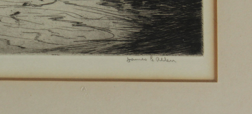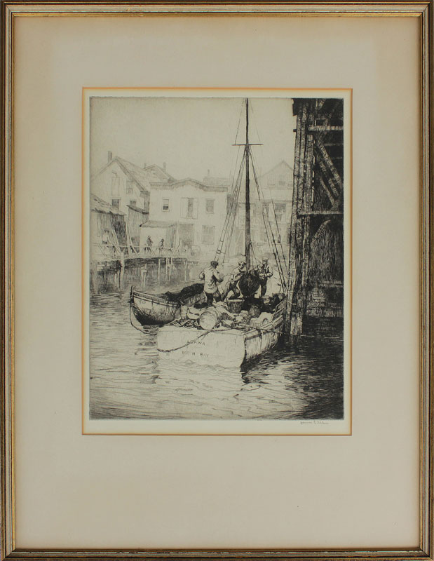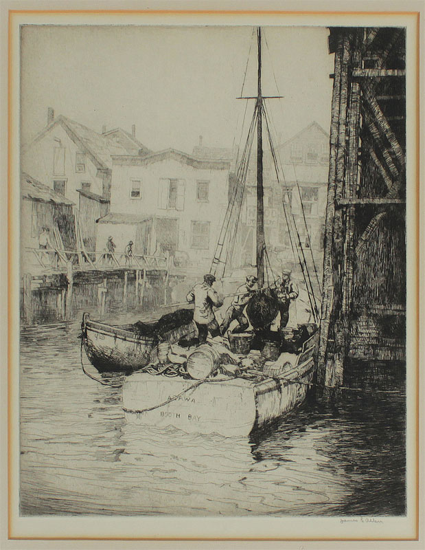 ALLEN, James Edward, (American, 1894-1964): Booth Bay Dockside Scene with Fishermen, Etching, Sight size 12 1/2'' x 10 1/4'', signed lower right, framed 20 1/2'' x 16 1/2''.