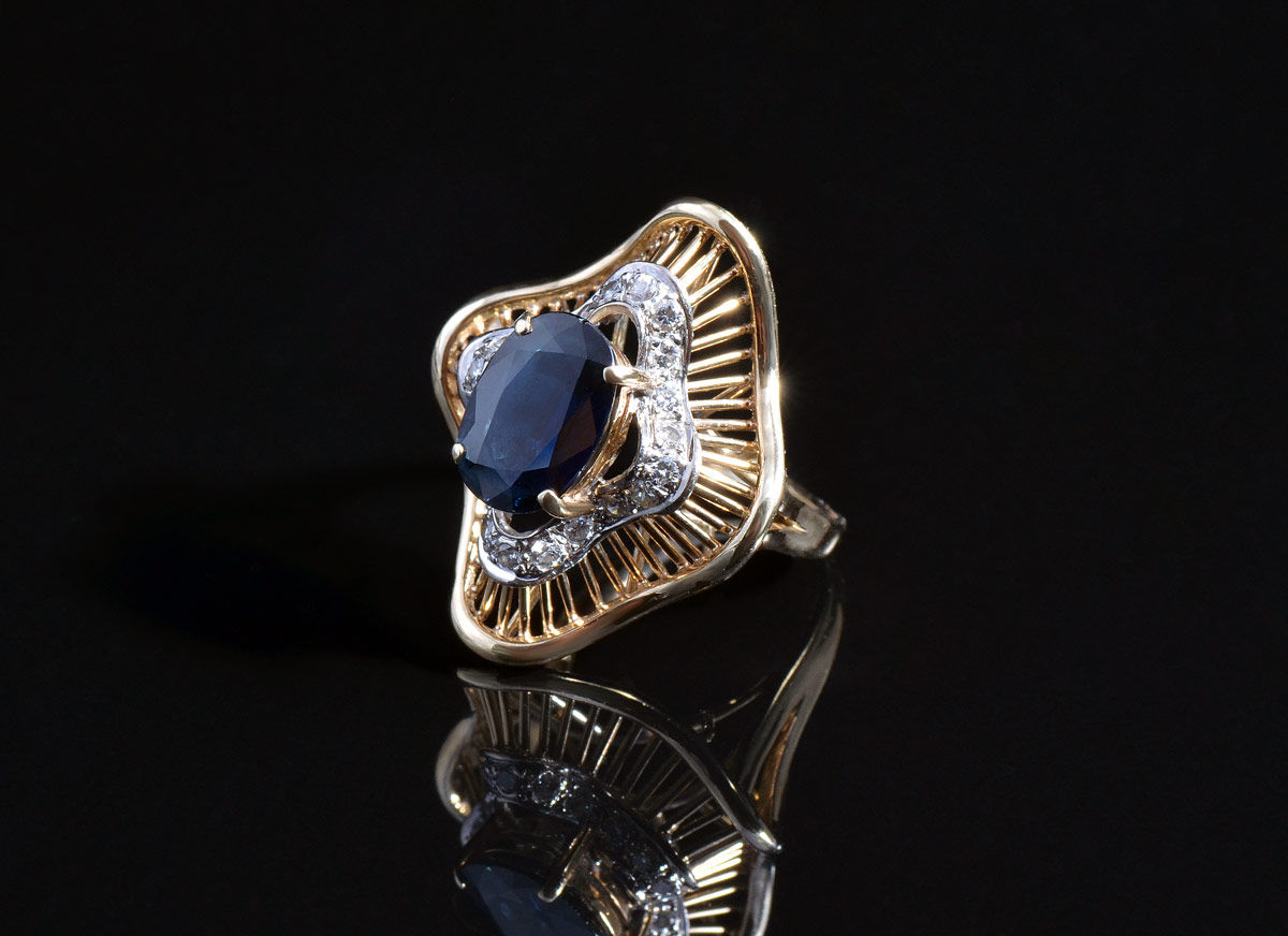 14K SAPPHIRE & DIAMOND RING: 14K yellow gold ring. Oval mixed cut sapphire in a wave of yellow gold. The sapphire is approx. 3.00 Ct. The round full cut diamonds total approx. .25 Ct., SI in clarity and H-I in color. Weight: 6.8 grams. Size: 5