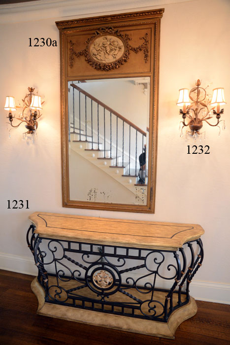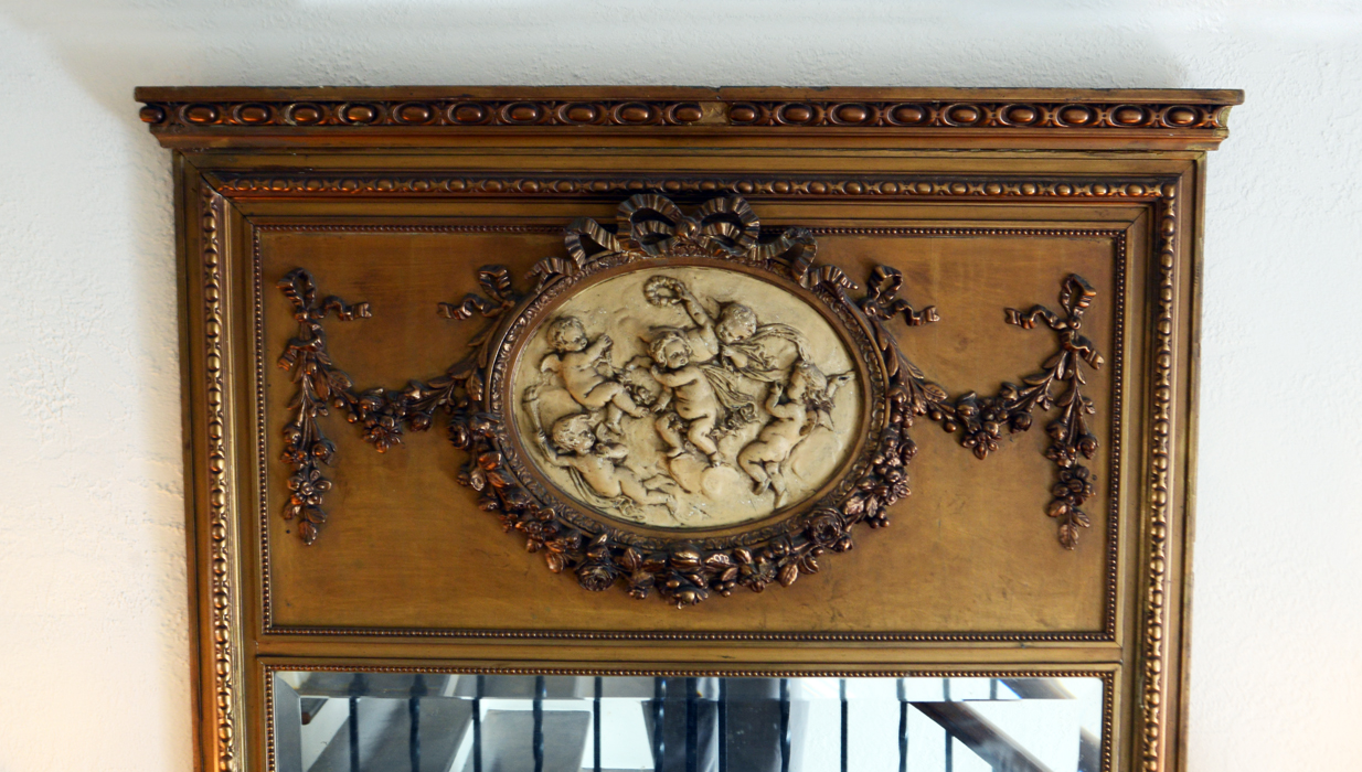 FRENCH STYLE CARVED GILT WOOD TRUMEAU MIRROR: Crest with applied cast plaque featuring cherubs, applied carved floral garland decoration. 49'' x 32 1/4'' beveled glass mirror, frame overall 75'' h. x 41 1/2'' x 1 3/4''.