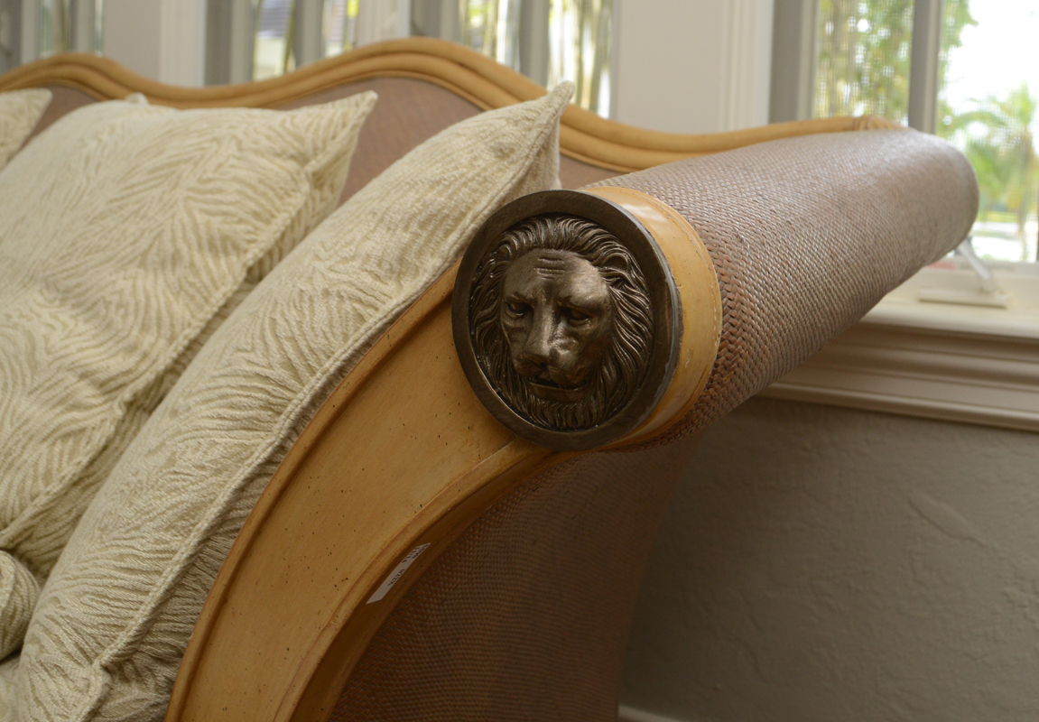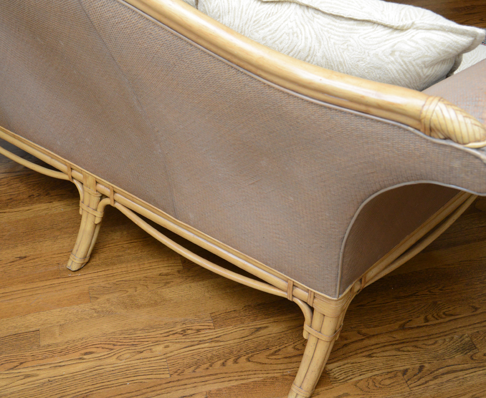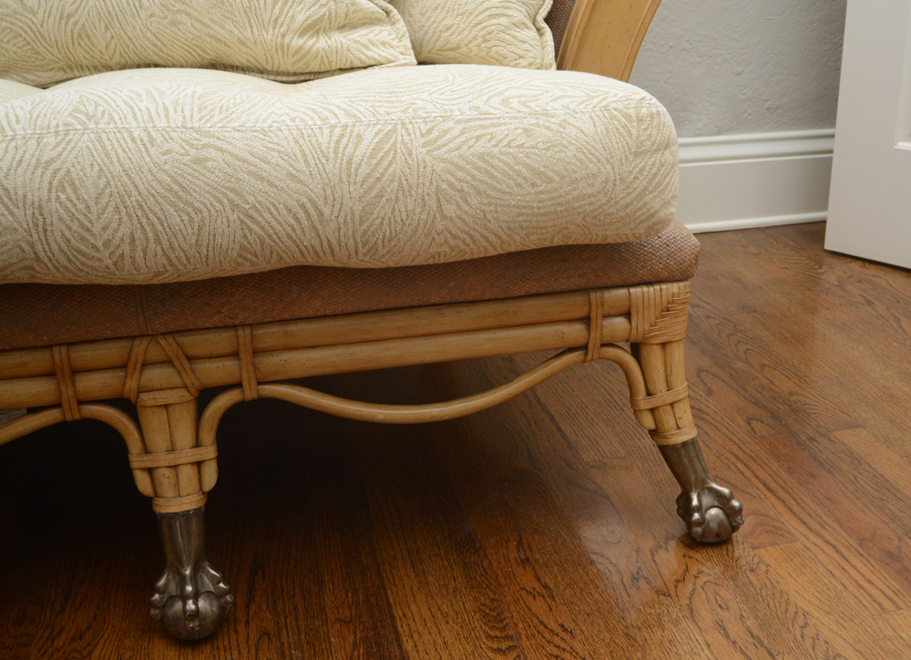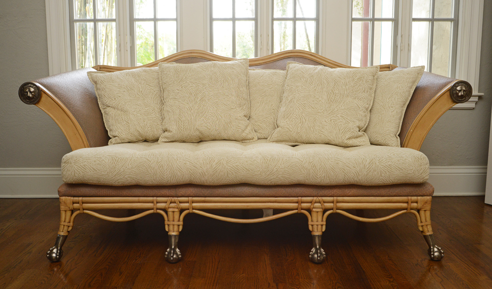 CONTEMPORARY MAITLAND-SMITH RATTAN STYLE SOFA: Faux rattan carved wood frame with splayed arms with cast metal lion masqueron medallions. Composite woven back, arms, sides and base, cast metal claw and ball front feet. Single seat cushion, 5 throw cushion back. Overall 39'' h. x 88'' x 40 1/2''.