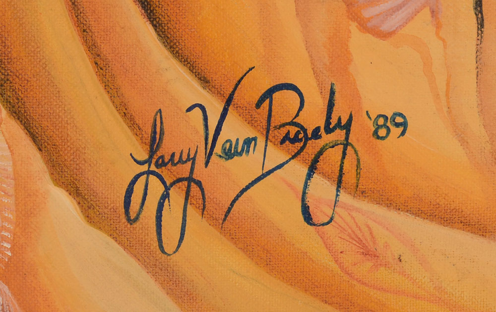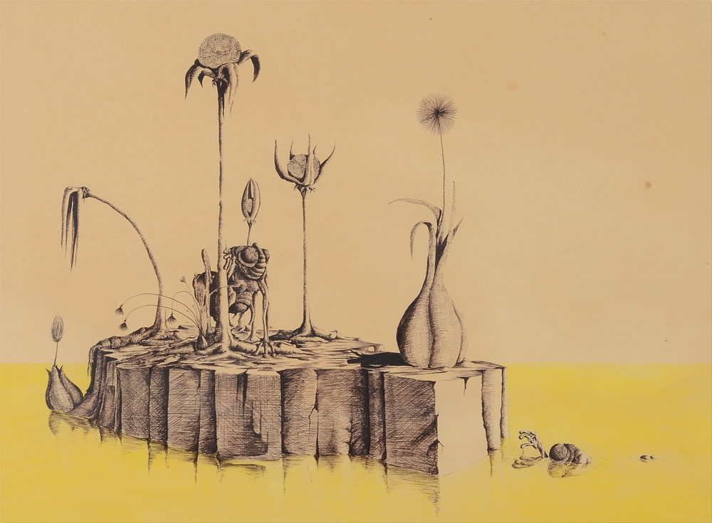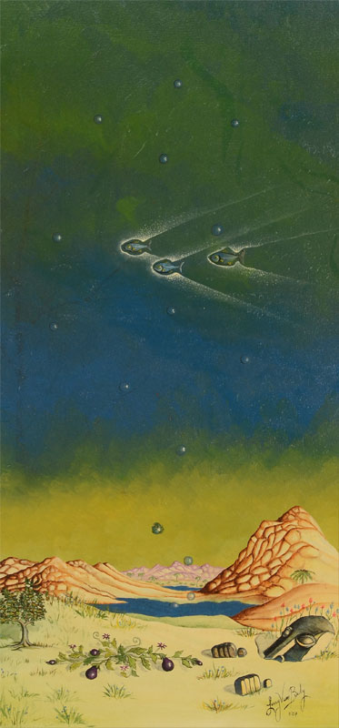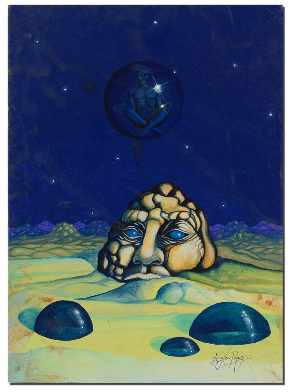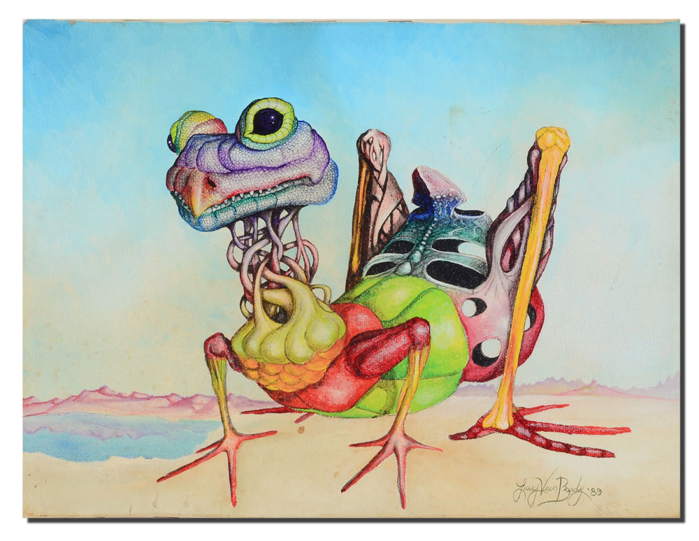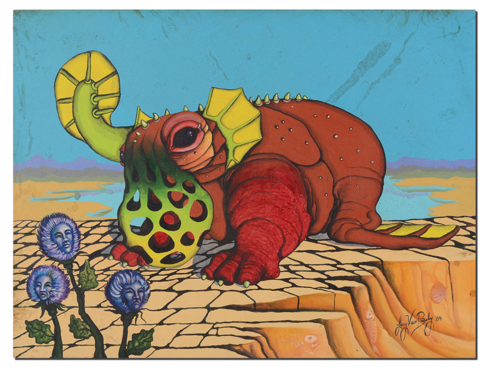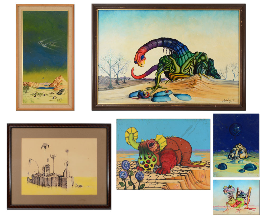 6 PC LARRY VERN BRADY SURREAL ART LOT: 1) Lizard Creature, Oil/Canvas, 9'' x 12'', signed lower right, dated '89, unframed; 2) Surreal Lunar Scene, Oil/Canvas, 16'' X 20'', SIGNED LOWER RIGHT AND DATED '89, UNFRAMED; 3) Fantastic Dinosaur-like creature in a Dali-esque landscape, Oil/Canvas, 18'' x 24'', signed lower right and dated '89, 4) Surreal Landscape with Flying Fish, 24'' x 12'', signed lower right, framed, 27'' x 15''; 5) Fantasy Dinosaur-like Animal with young, Oil/Canvas, 24'' x 36'', signed lower right, framed, 30'' x 39'', 6) Surreal drawing with flowers, sight size 14'' x 19 1/2'', signed lower right, framed, 22'' x 27''.