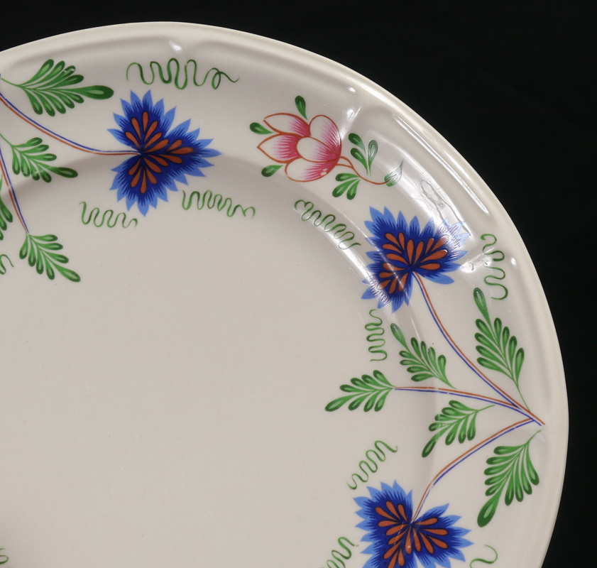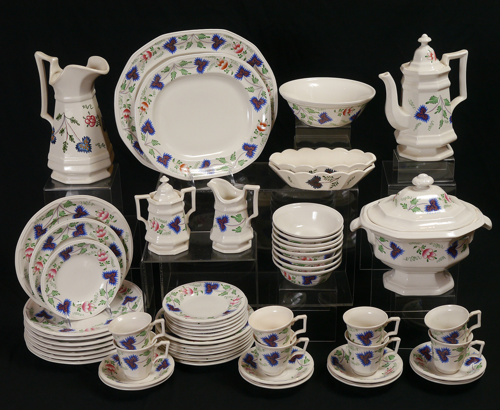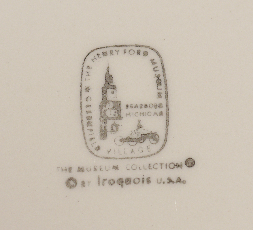 IROQUOIS THE HENRY FORD MUSEUM COLLECTION CHINA: Approx. 55 pieces marked ''The Henry Ford Museum, Greensville Village, The Museum Collection by Iroquois USA'' to include 8 dinner plates (10''), 7 salad plates (8 3/4''), 7 bread plates (7''), 8 soup bowls (6''), 8 teacups and saucers, 2 platters (largest 13'' x 15 1/2''), tureen (10'' h. x 12'' x 9 1/4'') with ladle, 2 relish, water pitcher (11 3/8'' h. x 7 3/4''), coffee pot, open creamer, covered sugar