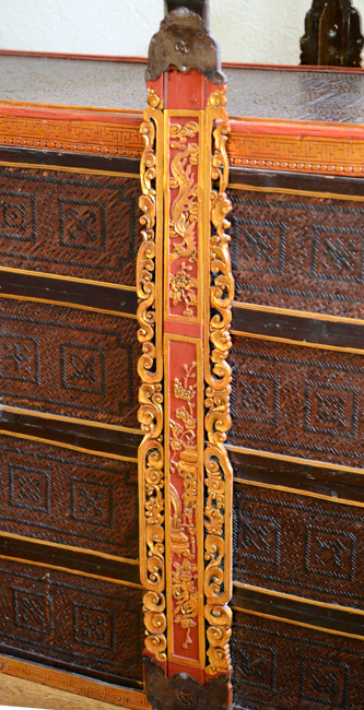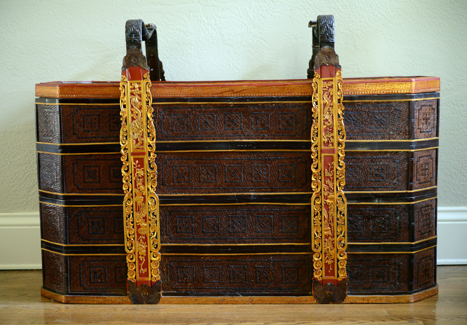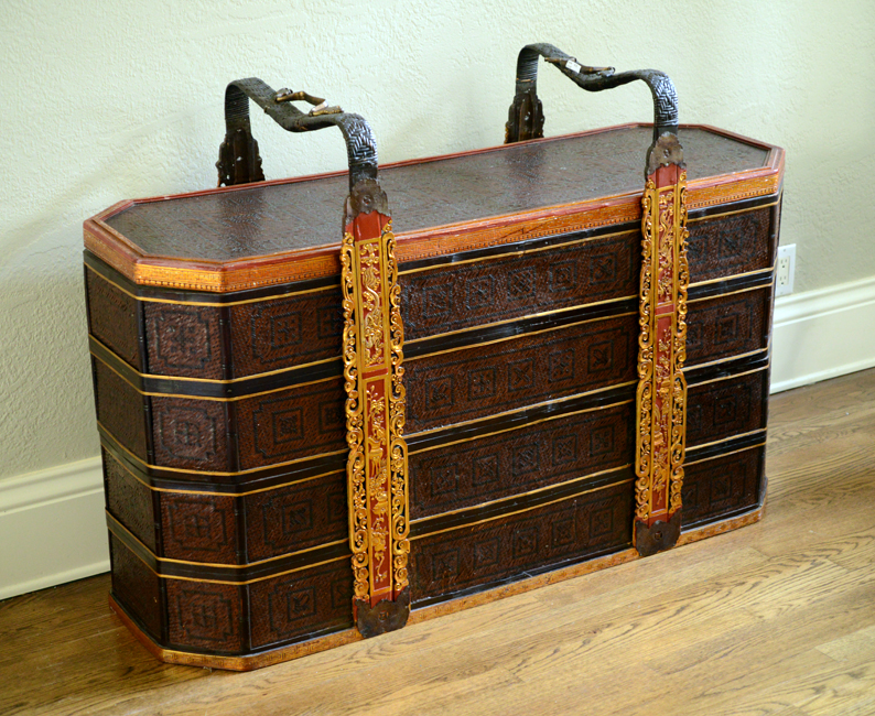 LARGE CHINESE WEDDING BASKET: Wicker handles with carved gilt and red lacquer supports with dragon motifs. 4 level basket with woven lid and sides with geometric motifs. 34 1/2'' h. x 50 1/4'' x 18''.