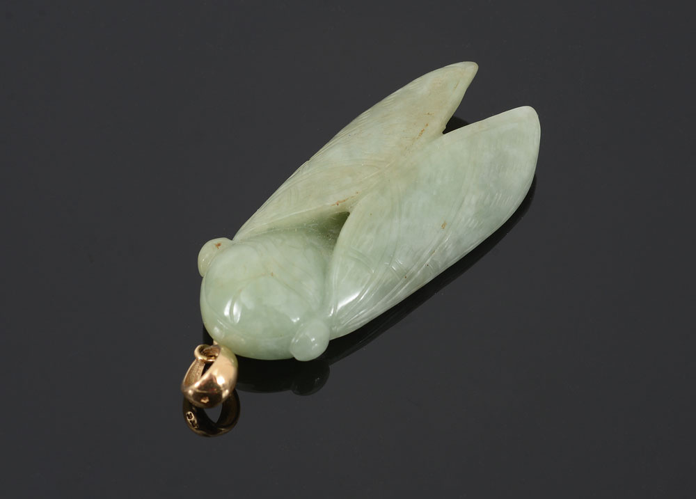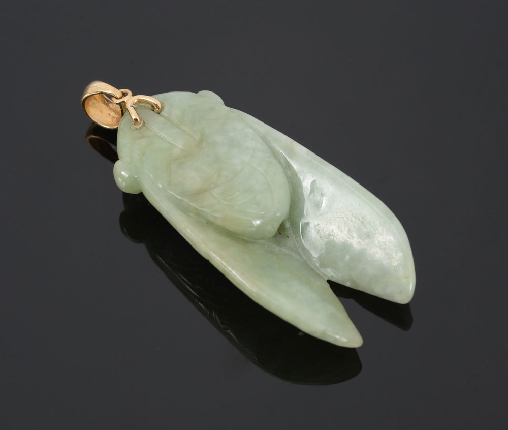 CARVED JADE LOCUST PENDANT: 2'' long carved locust with 14K yellow gold bail.