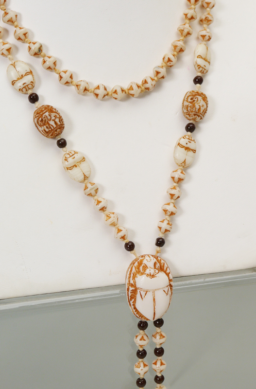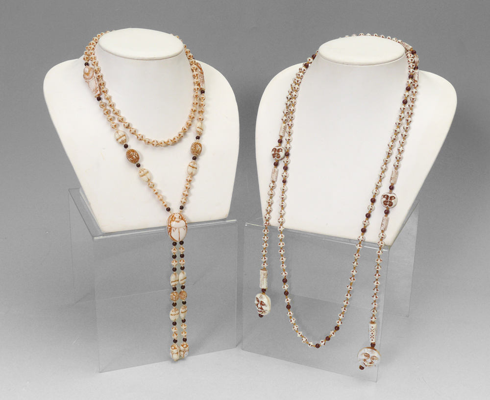 2 PC ''PEKING GLASS'' 1920'S EGYPTIAN REVIVAL NECKLACES: Glass beads and Egyptian motif figural elements. The lariat belt measures 60'', the necklace 48''.