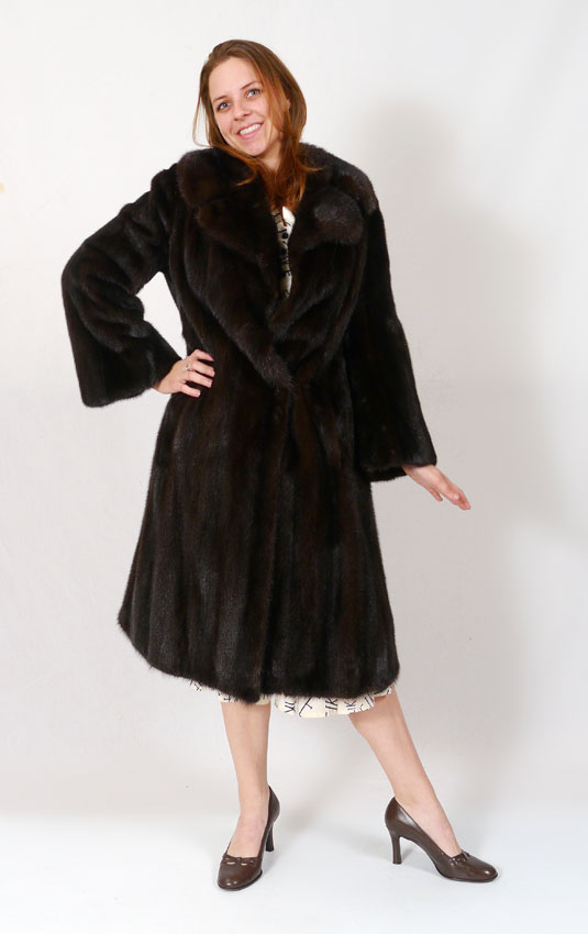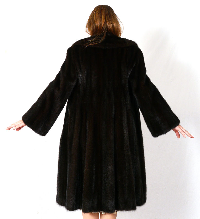 FULL LENGTH RANCH MINK COAT: Soft and supple dark ranch mink coat bears the Furs by George Populous and Blacklama labels. Medium size measures approx. 43'' collar to hem, 21'' shoulder to cuff and 18'' shoulder to shoulder, with a 75'' sweep.