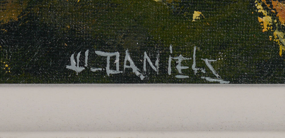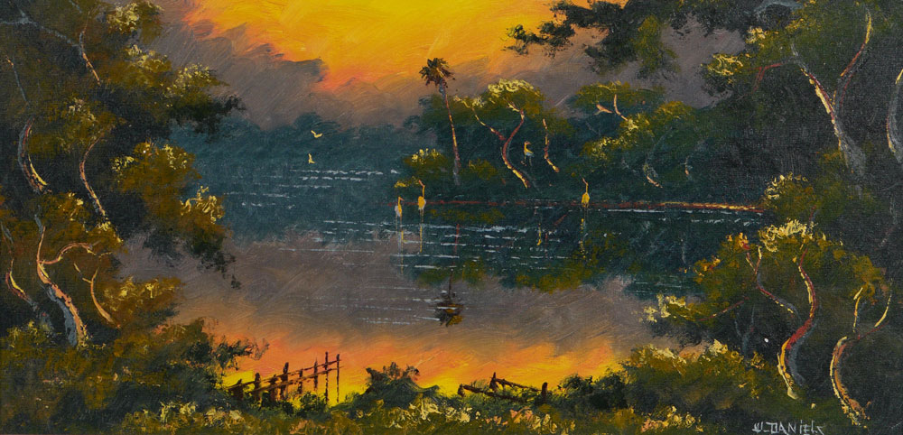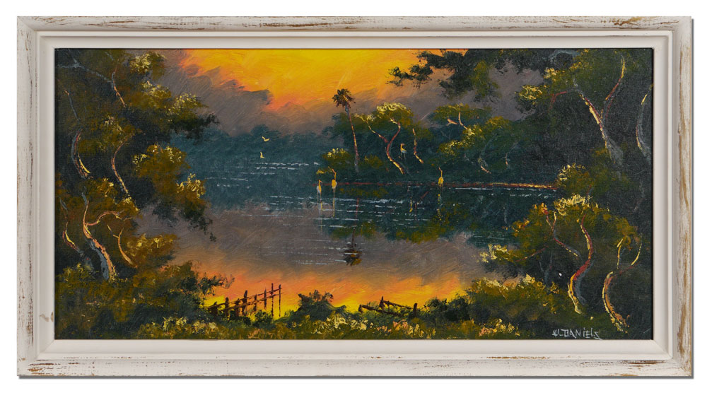 DANIELS, Willie, (American, 20th Century): Vibrant Florida Highwaymen backwater sunset scene with birds, Oil/Board, signed lower right, 12'' x 24'', framed 13 1/2'' x 25 1/2''.