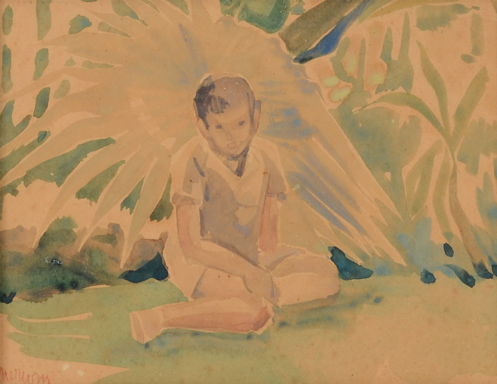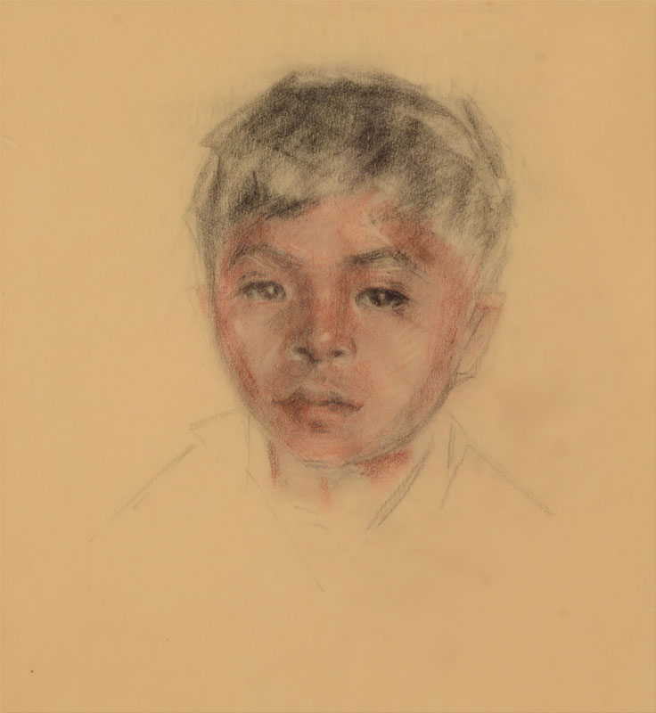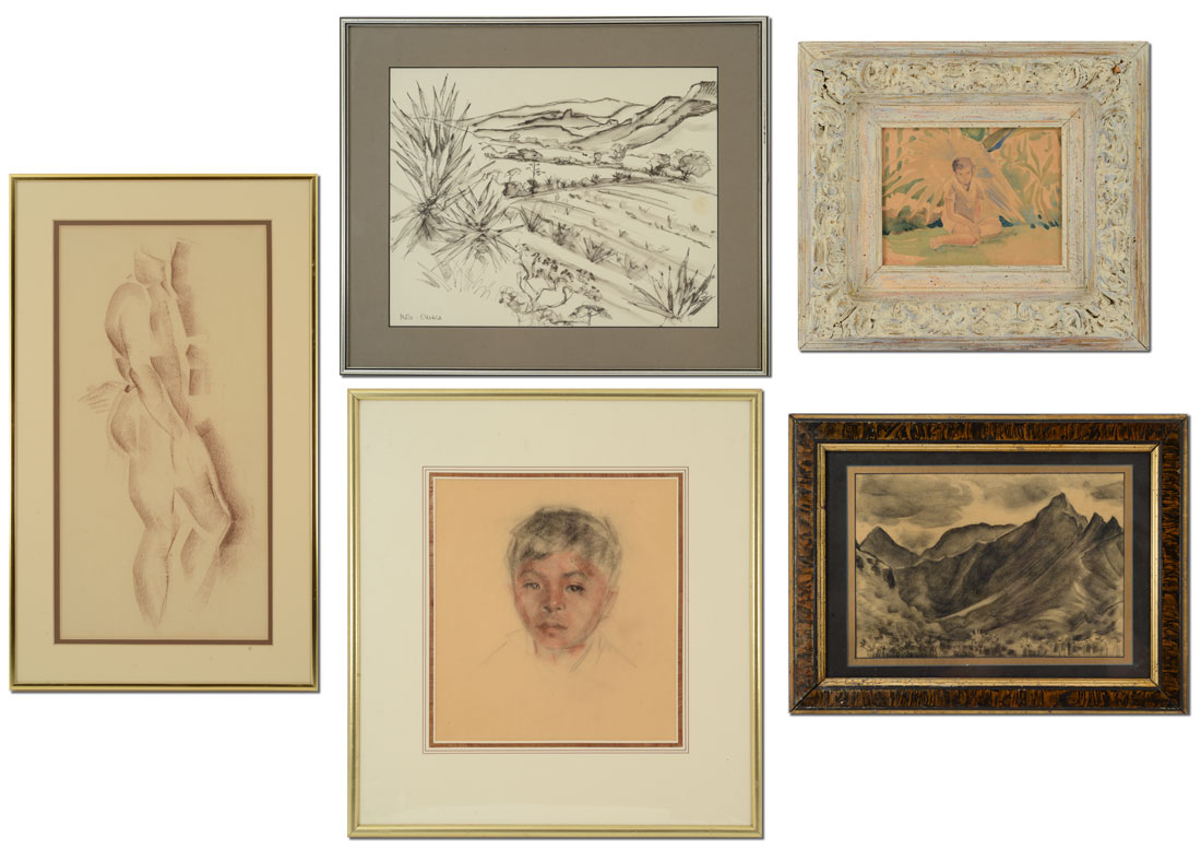 5PC ART LOT BY MERWIN HESTER AYERS: 1) ''Polynesia'', pencil drawing, sight size 7 1/2'' x 11'', framed, 12 1/2'' x 16 1/2'', Estate Stamp Verso; 2) Pen/Ink Drawing, Oaxaca, sight size 10 1/2'' x 13'', framed, 13'' x 17 1/2''; 3) Modernist Couple, Pencil Drawing, sight size 17'' x 8 1/2'', framed, 21 1/2'' x 12 1/2''; 4) Portrait of Young Boy, Drawing in color, sight size 10'' x 10'', framed,18 1/2'' x 17 1/4''; 5) Young Boy in Tropical Landscape, Watercolor, sight size 6'' x 8'', signed lower left, framed, 15'' x 16''.