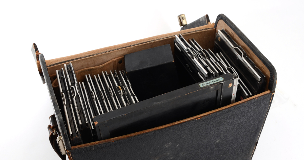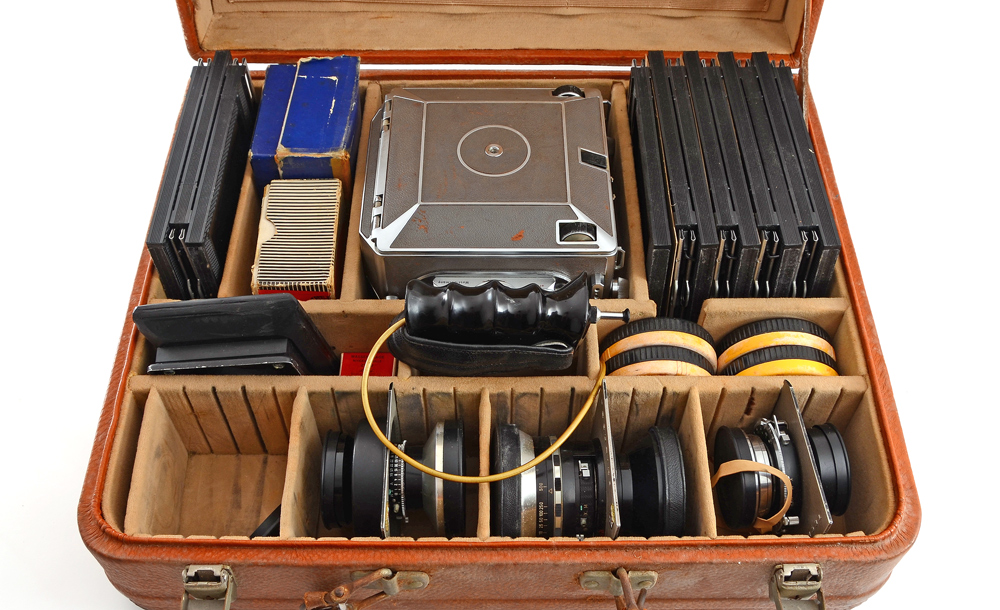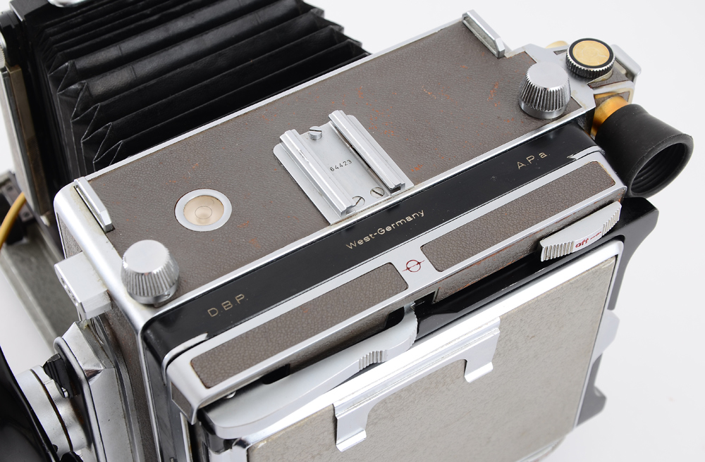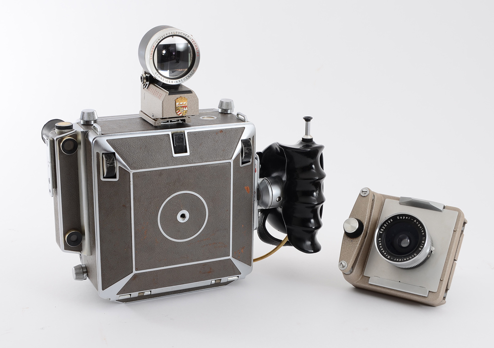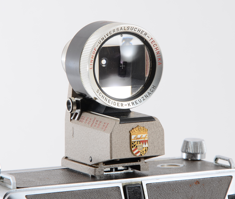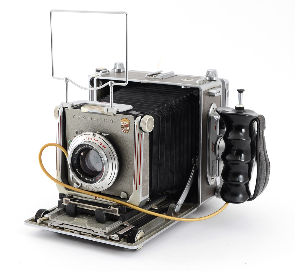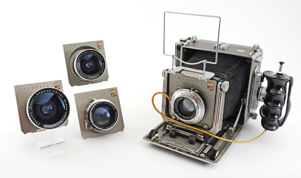SUPER TECHNIKA IV 4X5 LARGE FORMAT CAMERA W/ 5 LENSES: The Technika large format cameras are a legendary series of durable large format cameras still in limited/specialized use today. This example is a Super Technika IV, featuring an integrated rangefinder, and optional side handle with corded shutter release, as well as a Linhof - Universalsucher - Technika add-on viewfinder with Schneider - Kreuznach glass. Serial #64423 indicates a manufacture date of 1956-1957. Includes the following lenses: 1) Convertible Schneider-Kreuznach Symmar 150mm f/5.6 or 265mm f/12 Technika lens, serial #5318056. Equipped with Linhof shutter mounted to Linhof board. 2) Schneider-Kreuznach Super-Angulon 90mm f/8 wide angle lens mounted to a Synchro-Compur shutter on Linhof lens board, serial #5219775. 3) Schneider-Kreuznach Super-Angulon 121mm f/8 lens mounted to unknown shutter on a Linhof lens board, serial #5334369. 4) Schneider-Kreuznach Symmar 210mm f/5.6 lens mounted to Synchro-Compur shutter on Linhof lens board, serial #5565397. 5) Schneider-Kreuznach Super-Angulon 65mm f/8 lens mounted in a Linhof adapter plate, serial #6520136. This lot also includes an entire suitcase full of additional film boards (over 20), filters, and additional accessories.