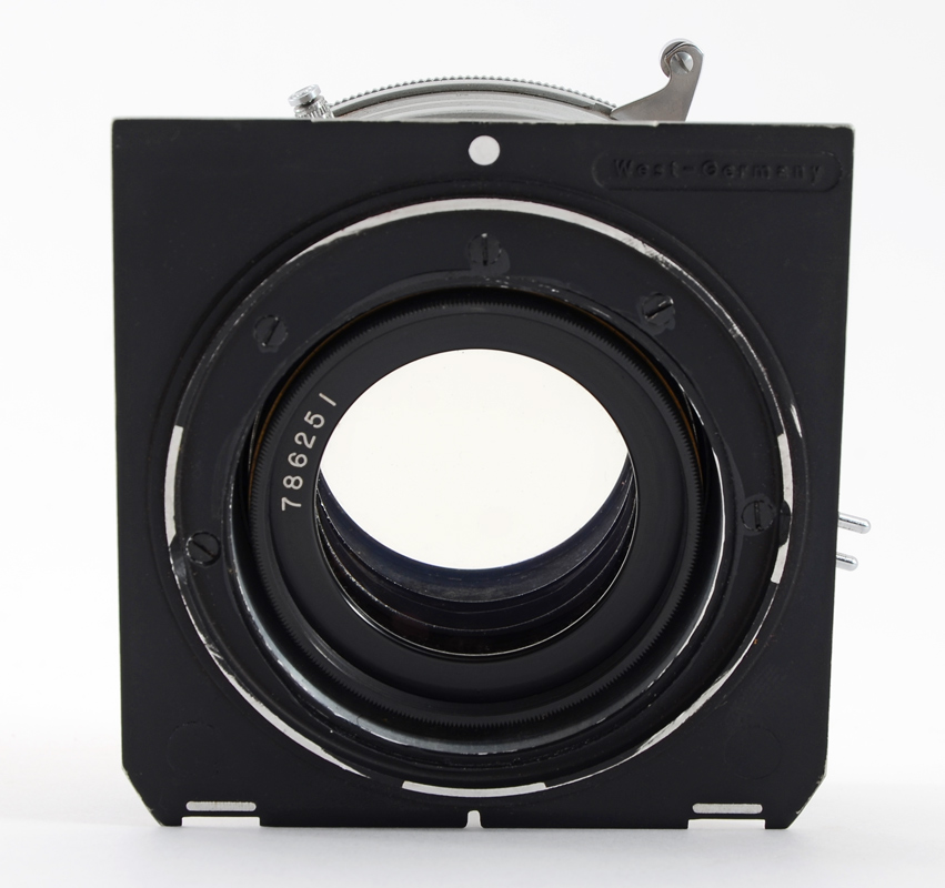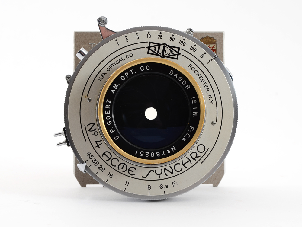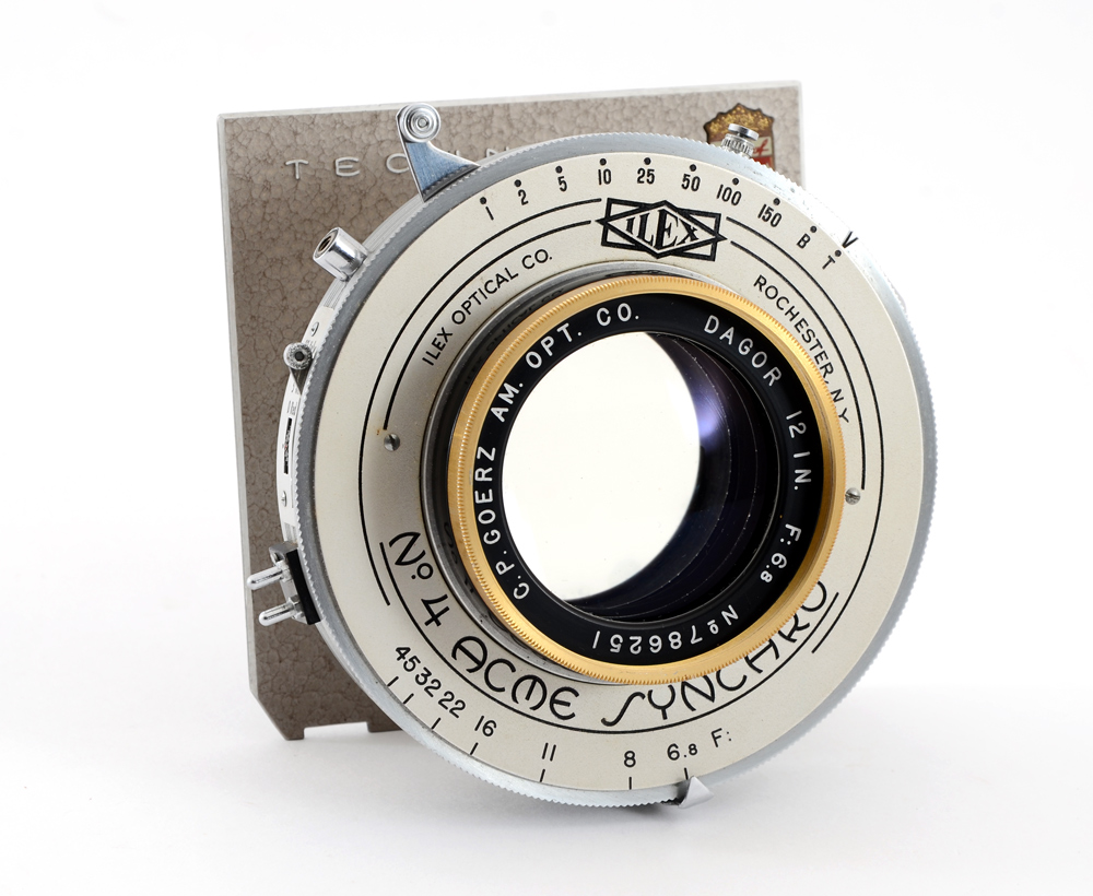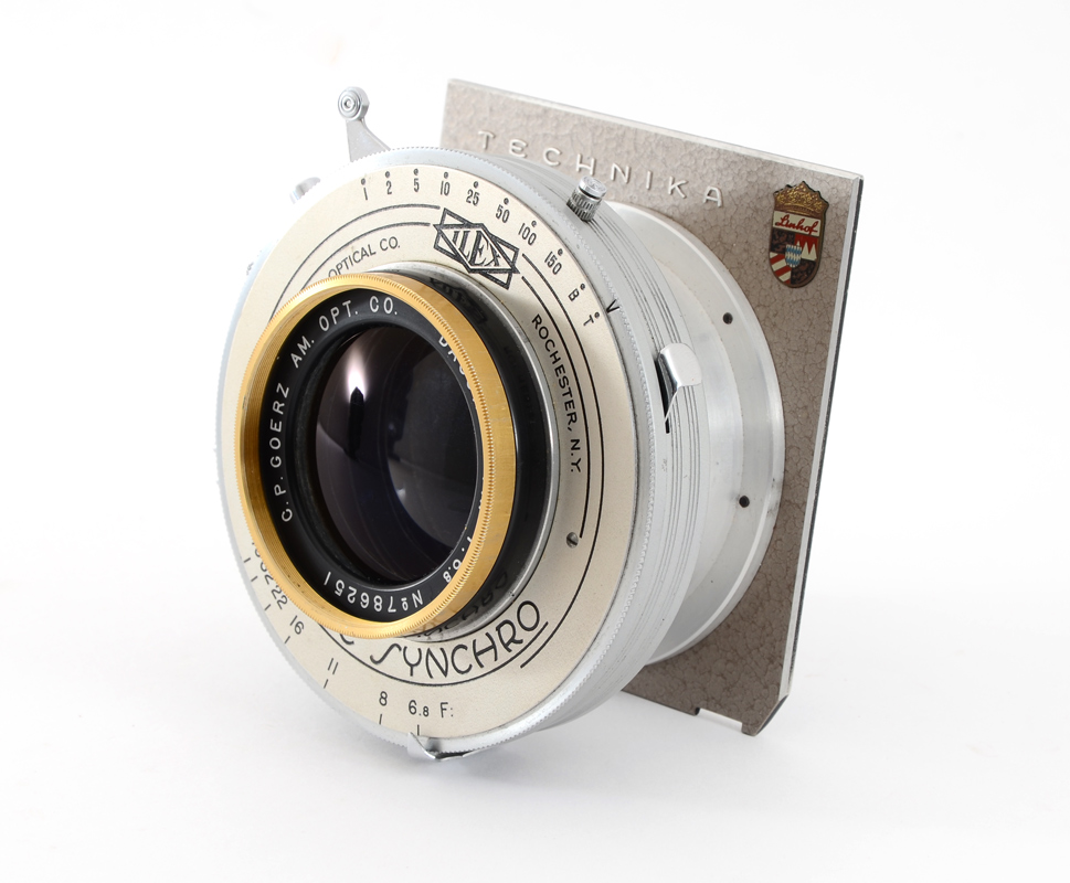 C. P. GOERZ 12'' F/6.8 GOLD RIM DAGOR LARGE FORMAT LENS: Also known as the Golden Dagor. This is an exceptionally rare lens in good exterior condition, with clean glass. The front of the barrel has the characteristic gold colored anodized aluminum ring. Manufactured approximately during the mid 1950's. Matching rear and front element Serial #786251. Equipped with a #4 Acme Synchro shutter mounted to a Linhof Technika lens board.