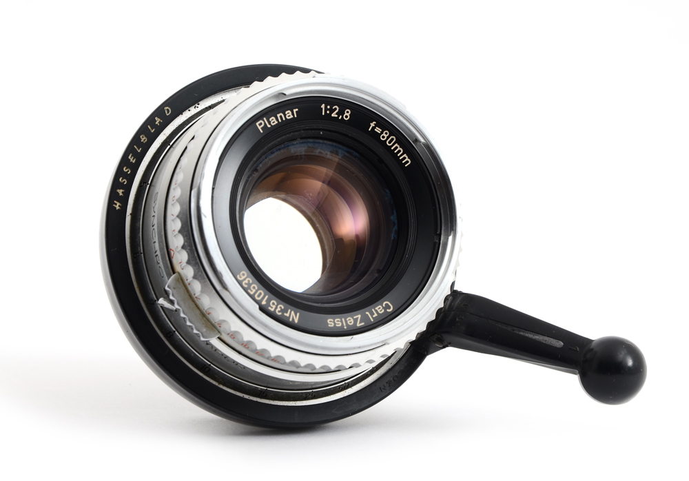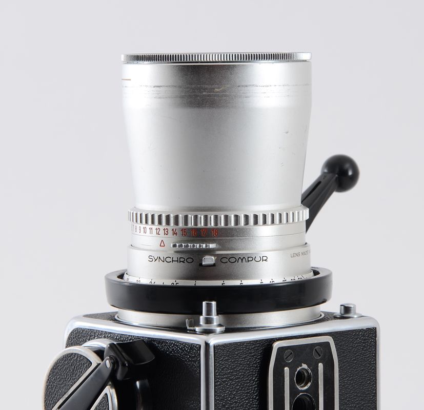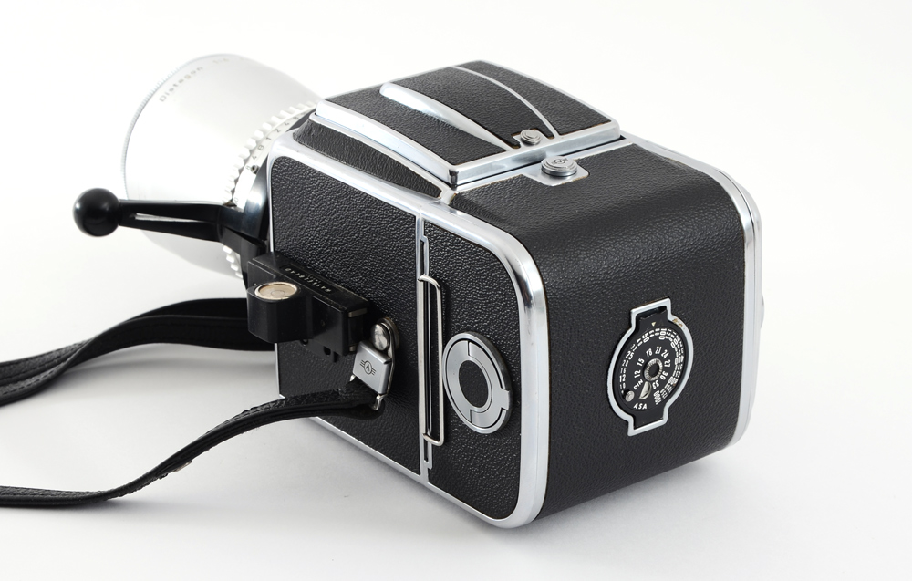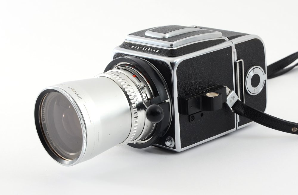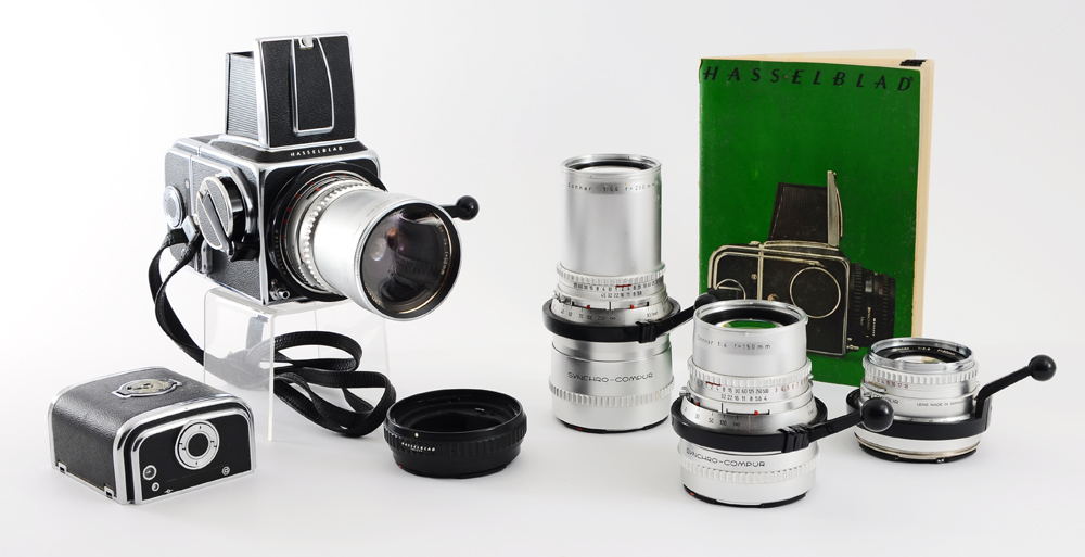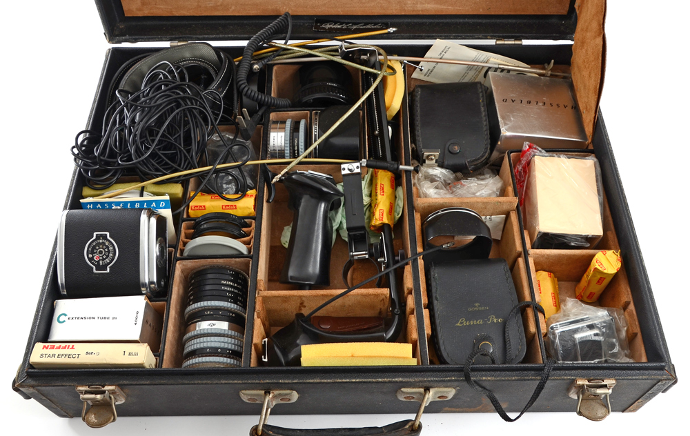 HASSELBLAD 500C CAMERA W/ 4 LENSES: A photographers complete kit including Hasselblad 500C body with three film holders and a plethora of lenses. The Hasselblad is a legendary, iconic medium format SLR camera of the 50's era, known for its sturdiness and optical quality. These cameras still see use today in some specialty markets. Digital backs do exist for this camera body and lens system. Lenses included are: 1) Carl Zeiss Sonnar 150mm f/4 lens #3460741. 2) Carl Zeiss Distagon 50mm f/4 lens #3879571. 3) Carl Zeiss Planar 80mm f/2.8 lens #3510536. 4) Carl Zeiss Sonnar 250mm f/4 lens #3572440. Kit includes a mind-blowing assortment of grips, corded shutter releases, various glass filters, Hasselblad level, an additional viewfinder lid, multiple extension tubes, film rolls, etc. Camera and equipment have specially fitted cases.