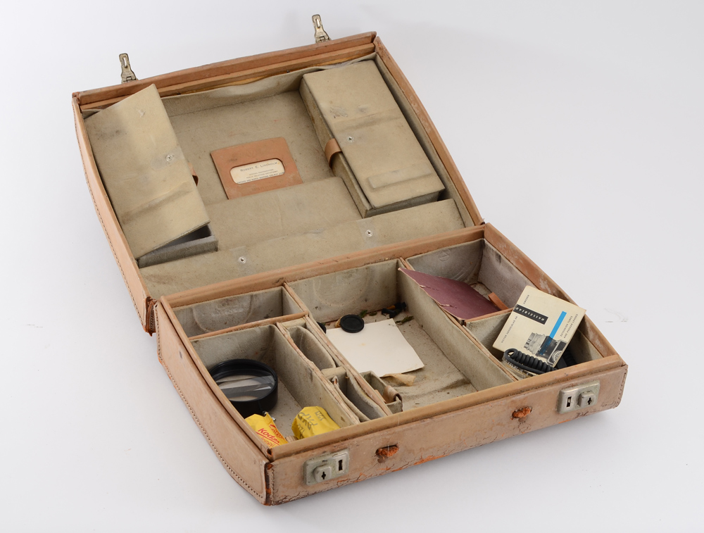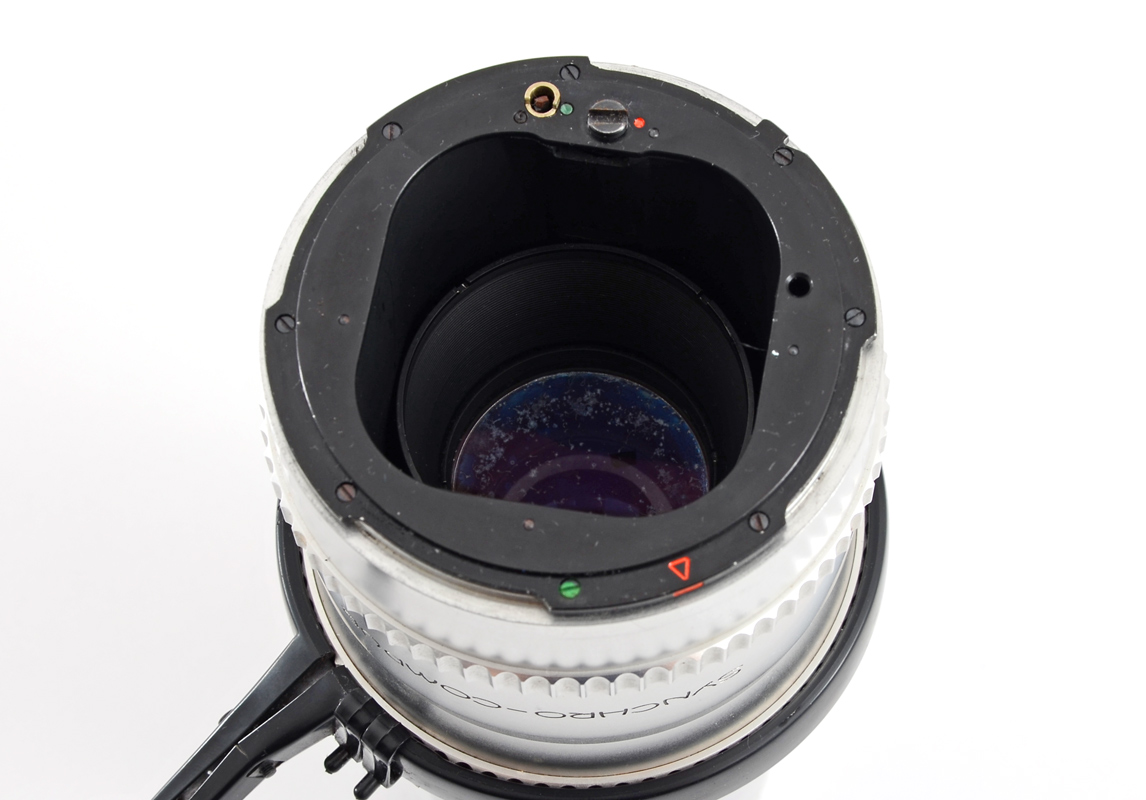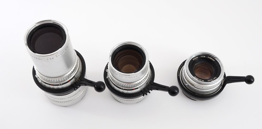 CONDITION: Externally the camera is in good condition, with shiny chrome and all leatherette panels intact. There is some cracking to the leatherette but nothing needing replacing. It appears the cocking mechanism was improperly engaged when mounting the lens, and will need to be disengaged before removal of attached lens. Functionality has not been tested because of this. The lenses need cleaning internally and externally. All lenses exhibit growth inside of the glass, with the 250mm lens exhibiting etching to the glass coatings. Image quality will most likely not be hugely affected in current condition. Both cases are in heavily weathered condition, and both may be disposed of at buyer's discretion as there is a heavy smell of mold within. Please call us for any other questions or concerns regarding this lot.