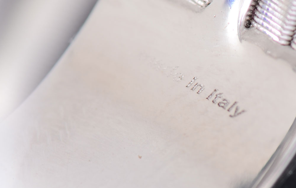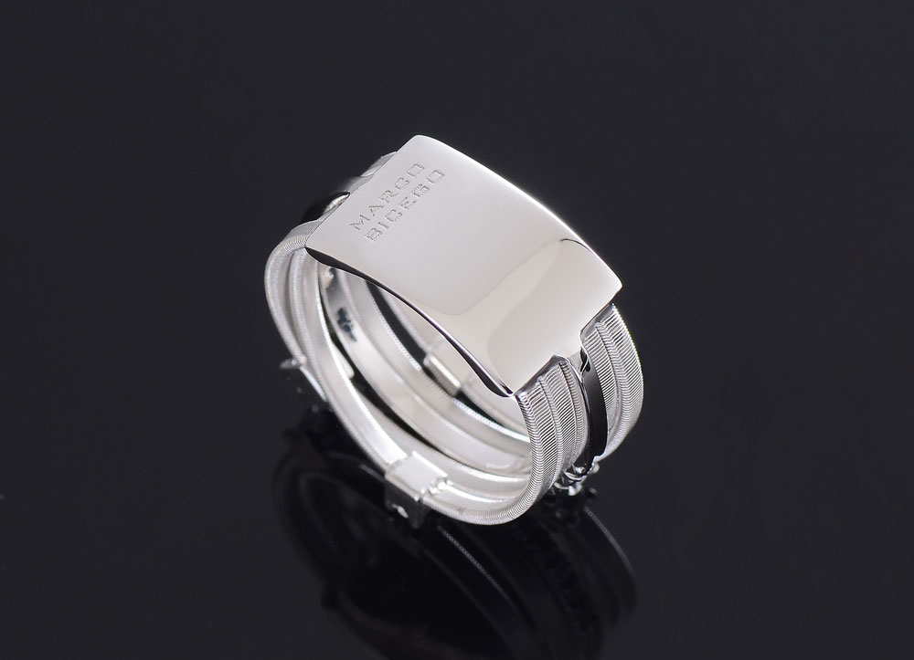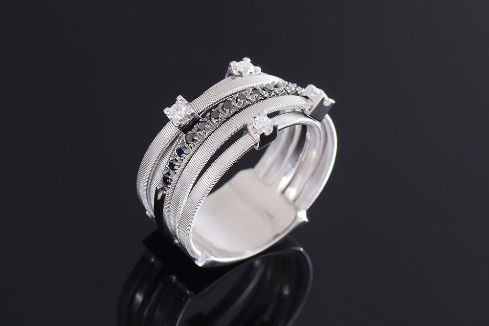 MARCO BICEGO BLACK DIAMOND GOA COLLECTION RING: 18K white brushed gold rings in a 5 stack ring effect, four each have a white diamond and one is a band of black diamonds, approx. .25 Ct. Size 6.5. Weight 7.5 grams. Currently retails for $2500.