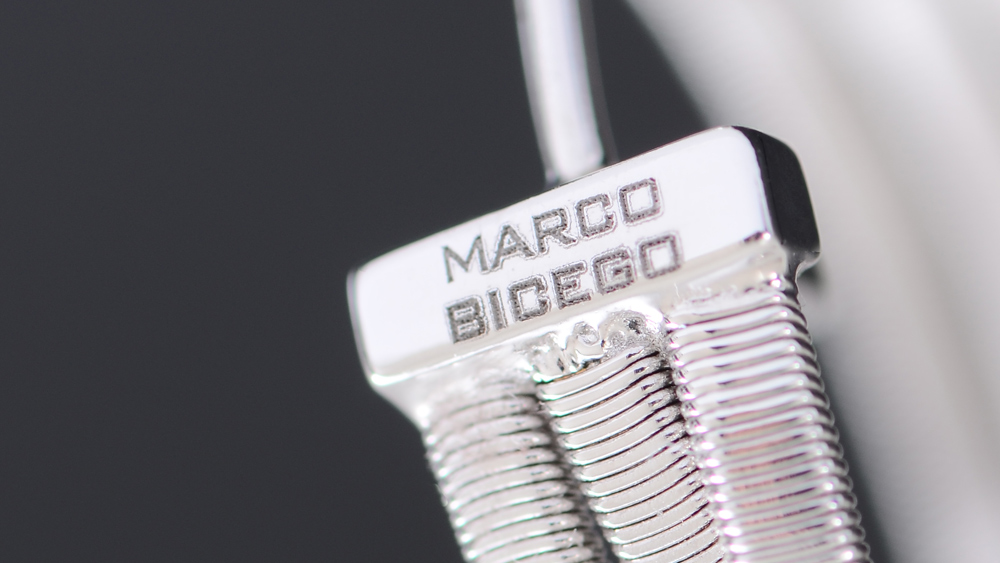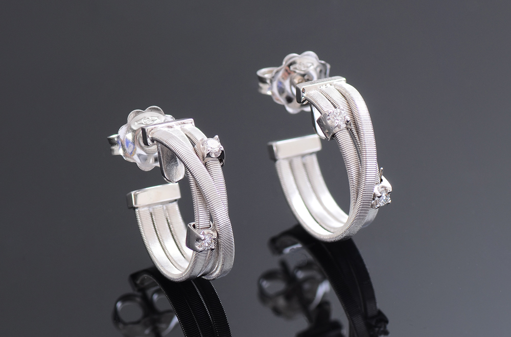 MARCO BICEGO GOA COLLECTION HOOP EARRINGS: 18k white gold 3 row earrings, each with 2 diamonds. Brushed finish, post closure. Weight 6.1 grams. Currently retails for $2150.