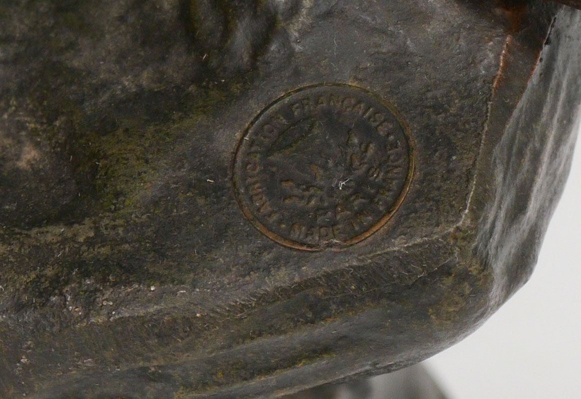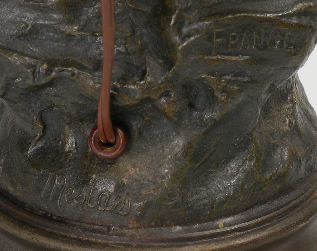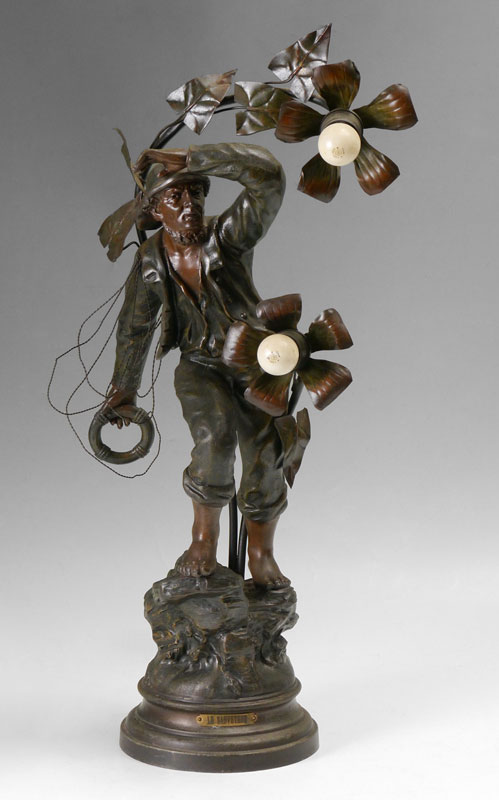 MESTAIS FRENCH FIGURAL LIFESAVER PATINATED METAL LAMP: Titled ''Le Sauveteur'', figure of a fisherman with a life ring, marked Mestais, France, with French foundry medallion. 2 socket fixture, overall measures 26'' h. x 13'' x 9''.