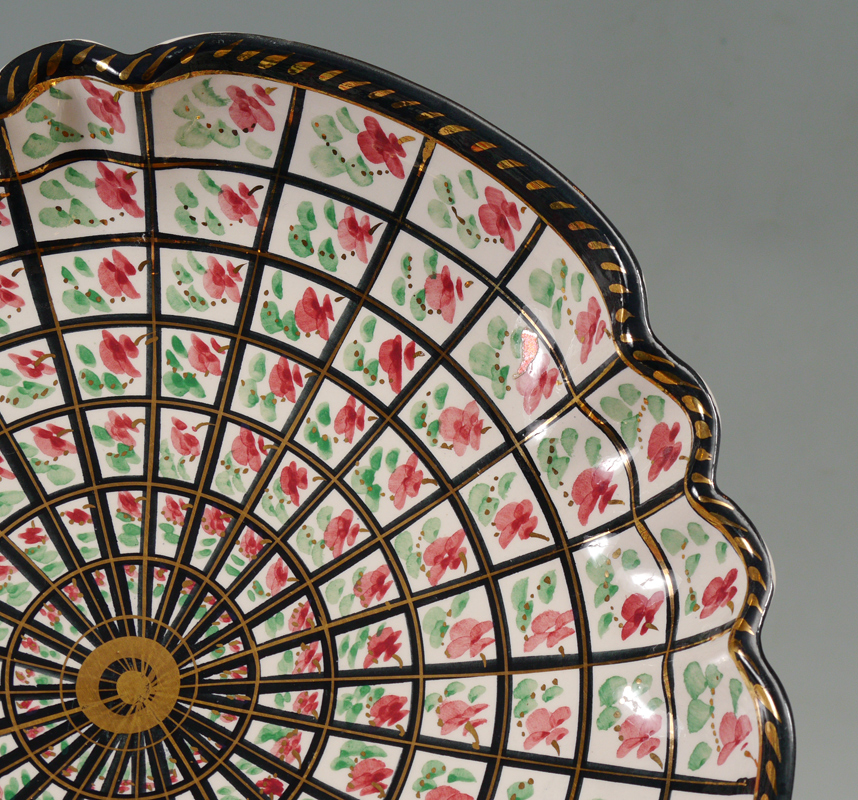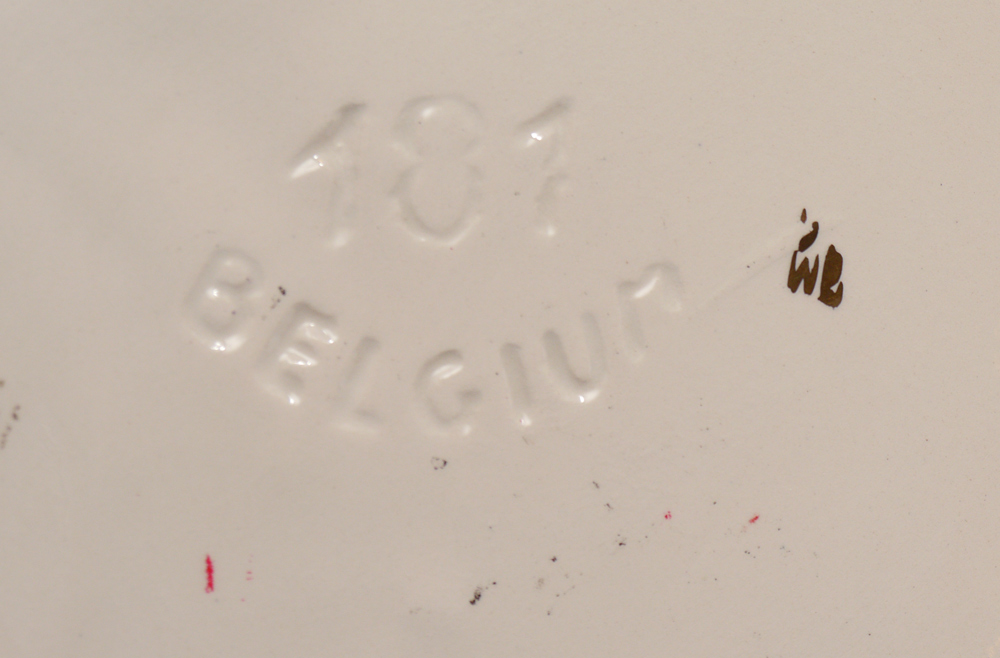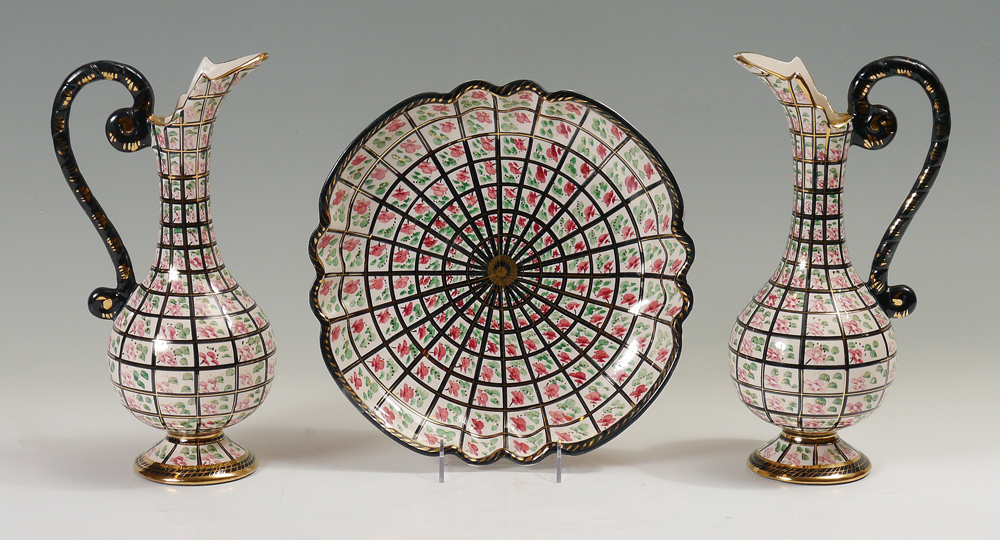 HAND PAINTED BELGIAN CERAMICS: 3 pieces total with hand painted floral and gilt, impressed Belgium mark on all. To include 1) Centerbowl, 2 3/8'' x 12 1/2''. 2) Pair of ewers, 13 1/4'' h. x 6 1/2''.