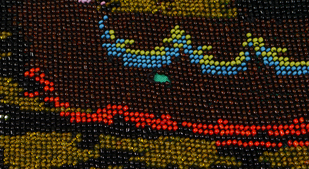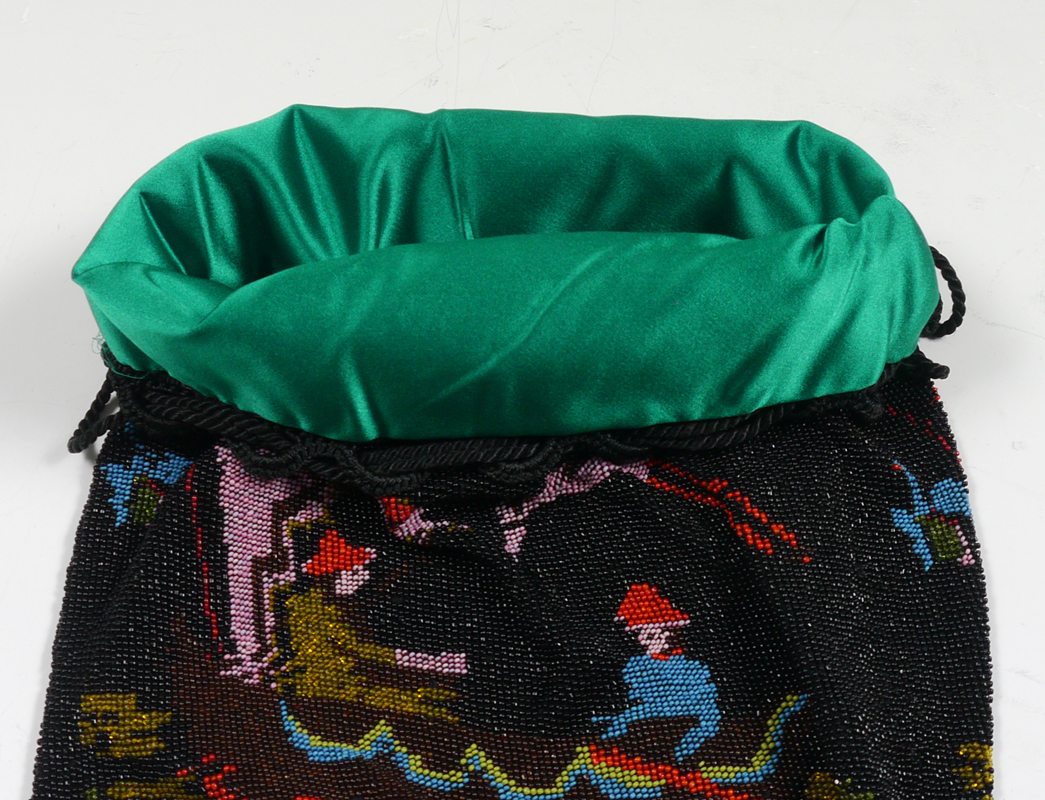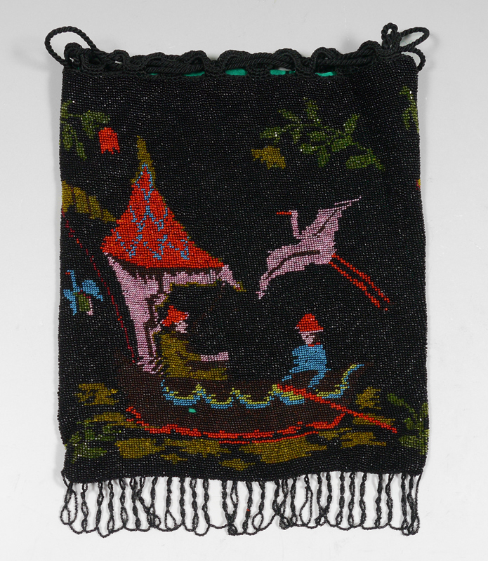 ART DECO BEADED PURSE: Draw string pouch in an Oriental design on a black ground. Interior in fine condition. Measures approx. 10'' x 10''.