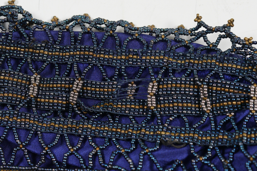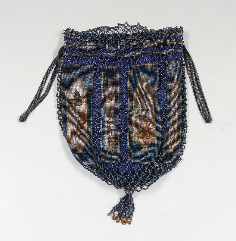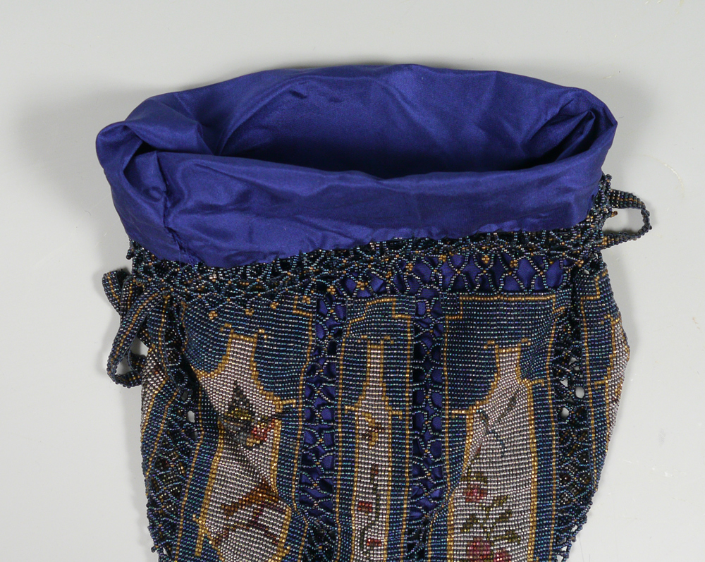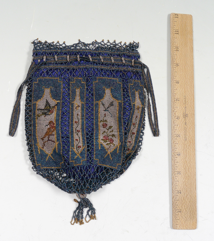 VINTAGE FRENCH ''TISSE'' CUT STEEL BEADED PURSE: Draw string bag in a blue bird design, lining is in new condition. Measures approx. 7'' x 6''.