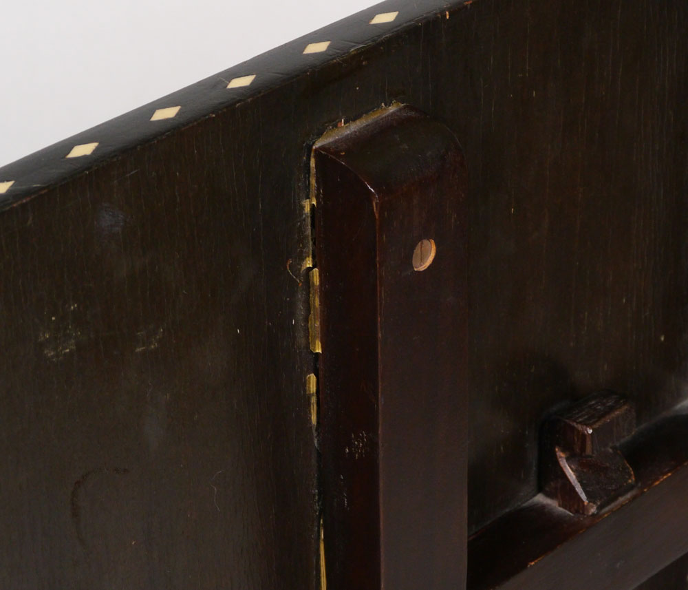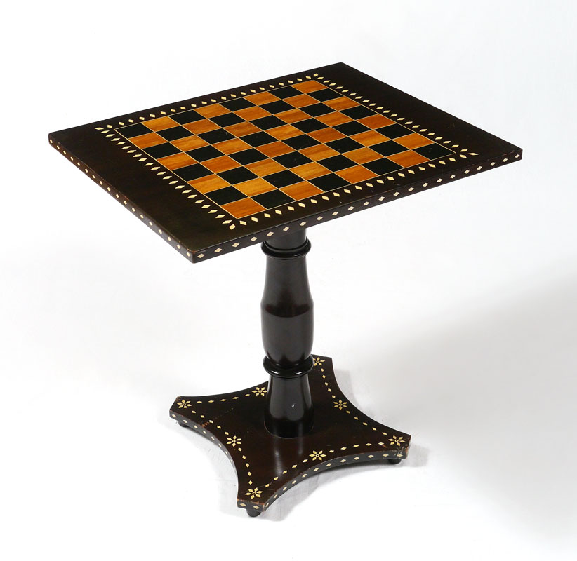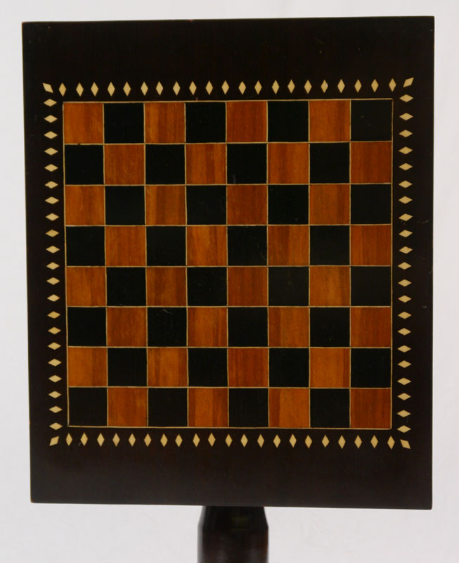 INLAID TILT TOP CHESS TABLE: Rectangular top with inlaid chess board and diamond patterns, turn support, base with inlaid diamond foliate swag patterns. Overall measures 24 1/2'' h. x 24'' x 20''.