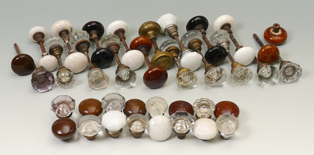 LARGE COLLECTION OF VINTAGE DOOR KNOBS: An assembled collection with approx. 15 complete knob sets, 22 separate handle and knobs to include porcelain, glass and brass.