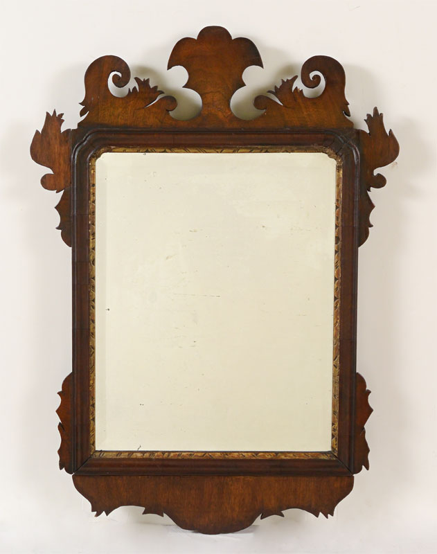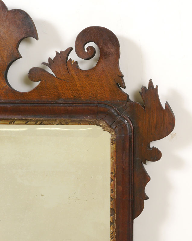 CHIPPENDALE CARVED WALNUT WALL MIRROR: Early to mid 19th century shaped walnut frame with carved gilt wood interior trim, beveled glass mirror. Overall measures 25'' x 18''.