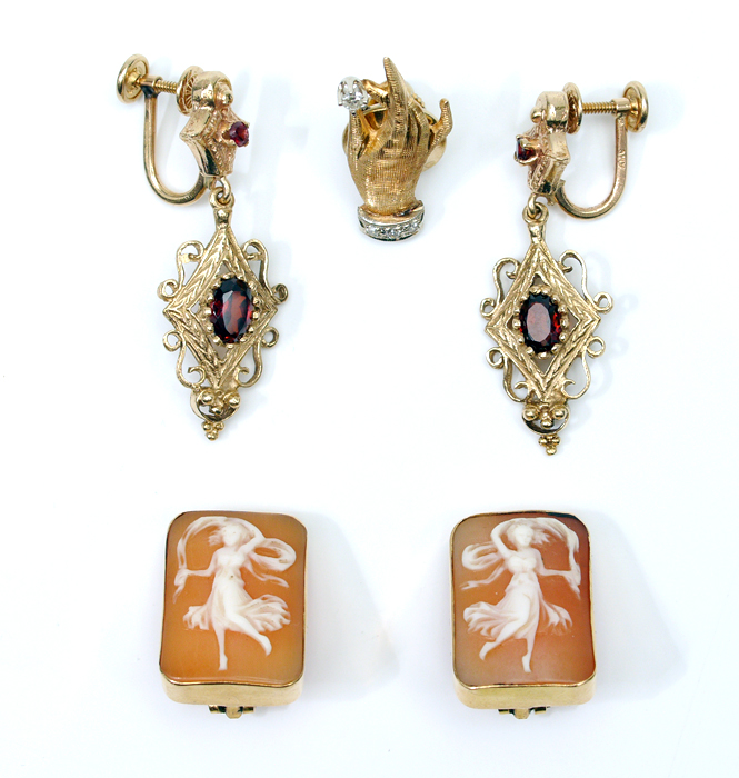 2 PAIR EARRINGS AND A TIE TACK PIN: 1) 18K dancing muse cameo earrings. 2) 14K garnet earrings with 2.00 CTW garnets. 3) 14K hand figural tie tack with .05 CTW diamonds. 18K weight: 5.0 grams approx. 14K weight: 8.6 grams.