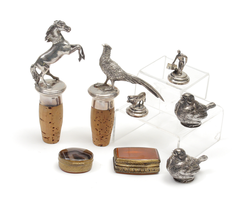 COLLECTION OF SILVER OBJETS DE VERTU: An assembled collection to include 1) Pair of figural wine corks with sterling mounted horse and pheasant, 5'' long overall. 2) Pair continental silver bird place weights, obscured hallmark, fineness unknown, 1 1/2'' h. 3) Bull and matador place weights, marked 916/1000 and obscured hallmark, matador 1 1/8''. Sold with 2 brass mounted pill boxes with hinged lids, one with inset agate, the other amber glass. 1 3/8'' x 1 1/8''.